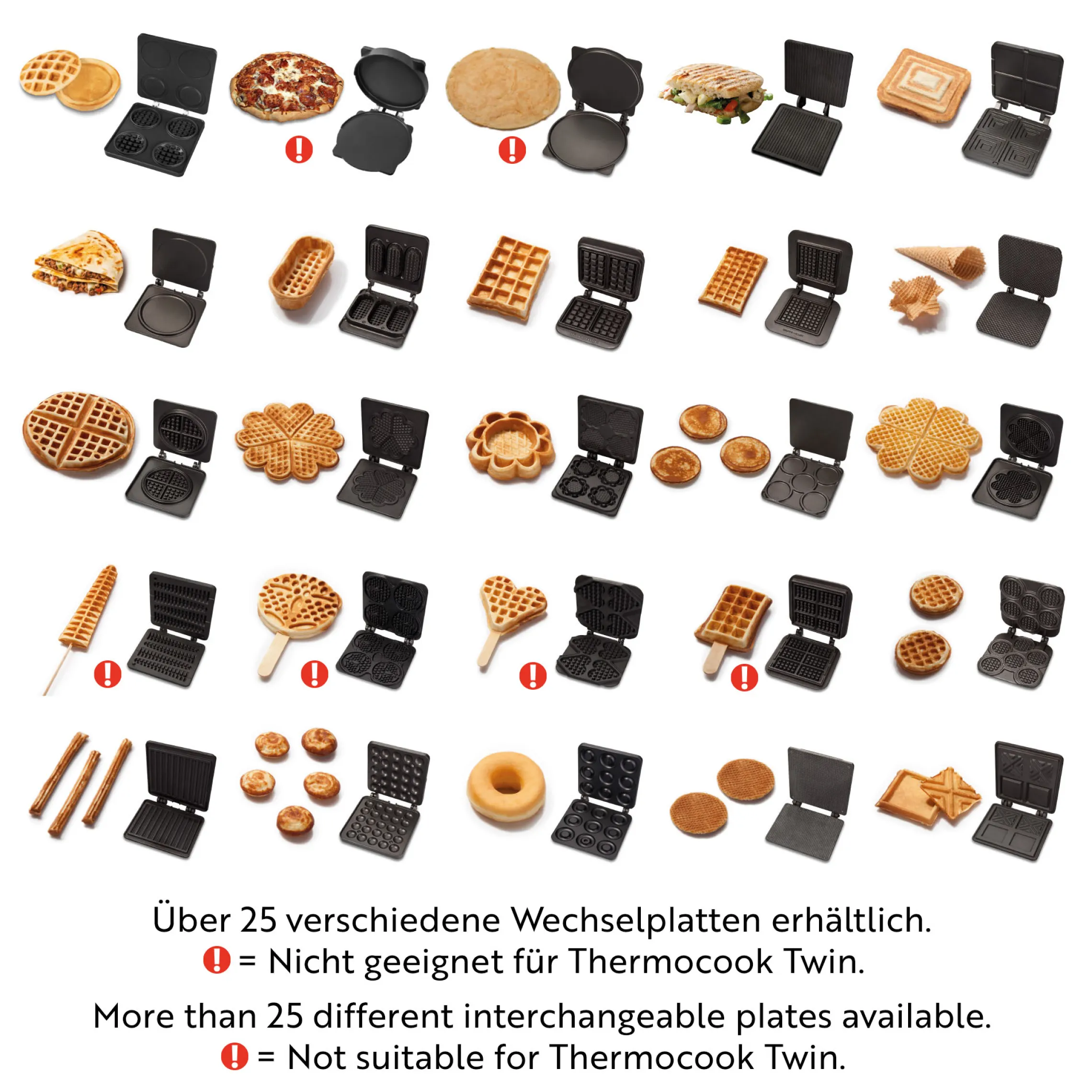 Über 25 separat erhältliche Wechselplatten eröffnen Ihnen eine riesige Bandbreite an Zubereitungsmöglichkeiten: Waffeln, Pizza, Crêpes, Paninis, Pancakes, Donuts, Sandwiches, Churros und viele weitere Spezialitäten gelingen zuverlässig und schnell. Das macht den Thermocook® zum perfekten Begleiter für Profiköche, Bäcker, Imbissbetreiber und ambitionierte Hobbyköche.