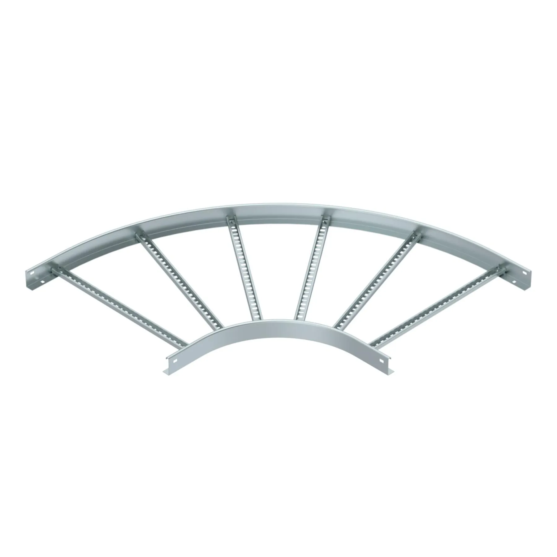 Mit einer Breite von 600 mm und einem Innenradius von 600 mm eignet sich der Bogen perfekt für mittlere bis große Kabeltrassen. Das flache Seitenholm-Profil mit geschweißter, gelochter Sprosse gewährleistet hohe Stabilität und erleichtert die normgerechte Kabelführung. Die gelochte Sprosse ermöglicht eine einfache Befestigung und ein übersichtliches Kabelmanagement, was besonders bei komplexen Installationen von Vorteil ist.
