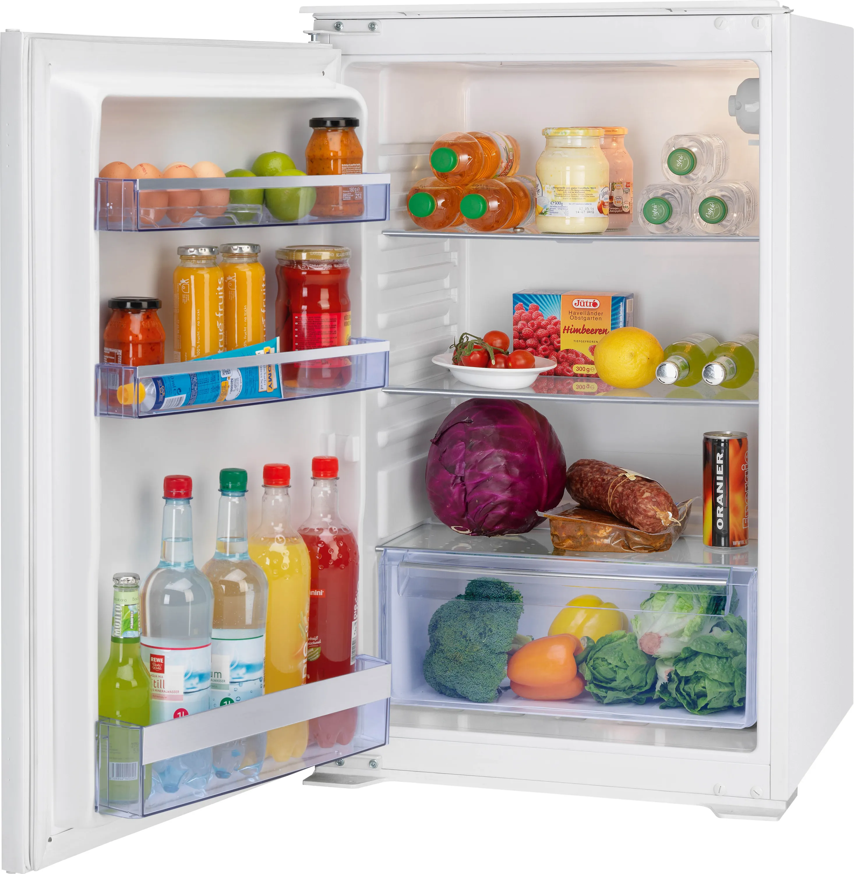 Das durchdachte Vollraum-Design bietet viel Stauraum: Drei stabile Glasabstellflächen (zwei davon höhenverstellbar) und ein transparentes Gemüsefach sorgen für Übersicht und flexible Organisation. In den großen Türfächern finden Flaschen, Dosen, Eier und Milchprodukte ihren festen Platz. Ein separates Butter- und Mehrzweckfach erleichtert die Aufbewahrung kleinerer Lebensmittel.