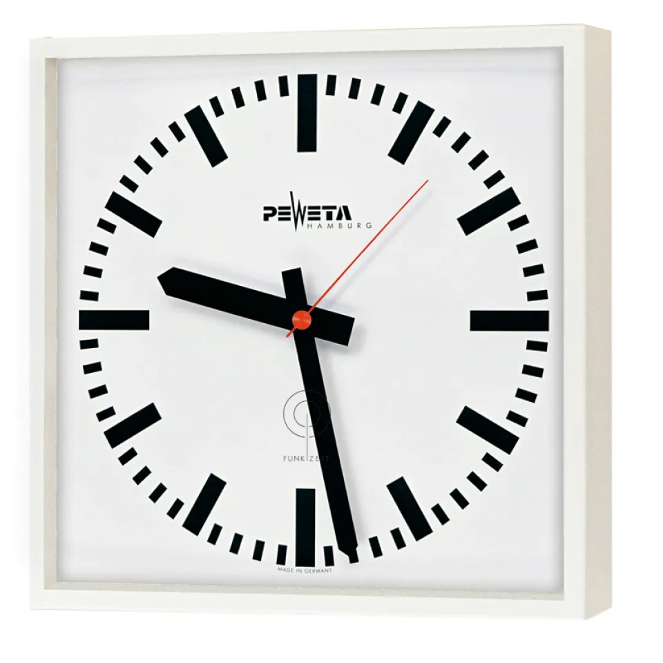Innenuhr, quadratisch, einseitig, Metallgehäuse, weiß lackiert (RAL 9016), flaches stoßgeschütztes Acrylglas. Weißes Metallzifferblatt mit schwarzen DIN-Balkenziffern, Zifferblattdruck nach DIN 41091. Schwarze DIN-Balkenzeiger für Stunden- und Minutenanzeige, bzw. rot für Sekundenanzeige. Batteriebetrieb.