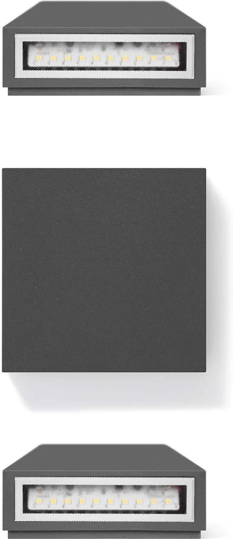 LED Wand- und Deckenleuchte für Innen- und Außenbereiche, bestehend aus: Gehäuse aus Aluminiumdruckguss mit Polyesterpulverlackierung. Diffusor mit Mikroprisma, aus temperiertem Flachglas, Innenseite siebbedruckt. Silikondichtung. Polyester-Pulverbeschichtung, bestehend aus 13 unterschiedlichen Schichten, schützt vor UV-Strahlung.