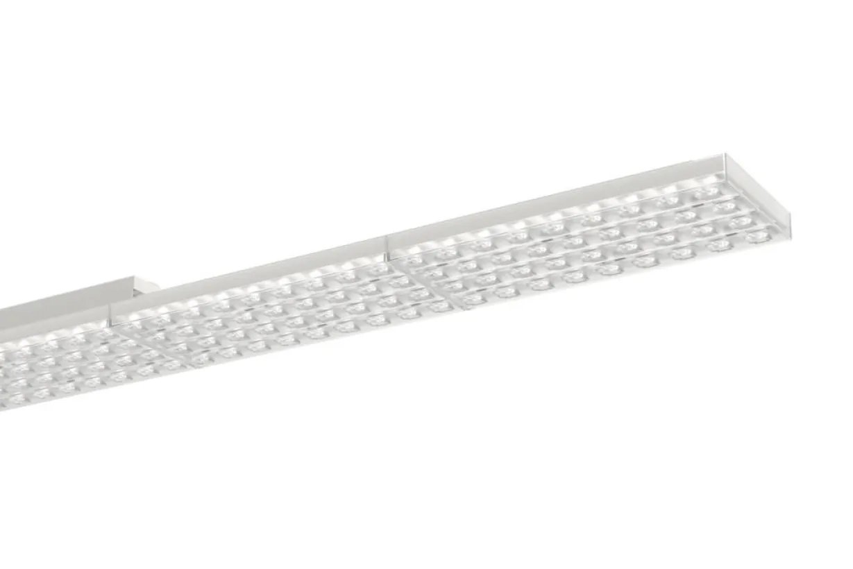 Moderne, flache LED-Anbauleuchte mit quadratisch ausgeprägten, 4-reihigen Linsenoptikarrays mit optisch harmonisierter Oberflächenstruktur für effiziente Lichtausbeute. Hochwertige, rechteckige Konstruktion aus Aluminiumstrangpressprofil, pulverbeschichtet. Gesamthöhe 20 mm im Randbereich, 35 mm im Mittelbereich. Aufbauhöhe im Bereich der Deckenbefestigung 58 mm. Midpower LED-Module für maximale Leuchteneffizienz. Schutzklasse I, Schutzart IP20. Lichtverteilung direkt. Lichtlenkung direkt über Optikarray. Montage: Direkter Deckenanbau durch Vormontage des Deckenbleches, anschließend Einhängen und fixieren des Leuchtenkorpus.