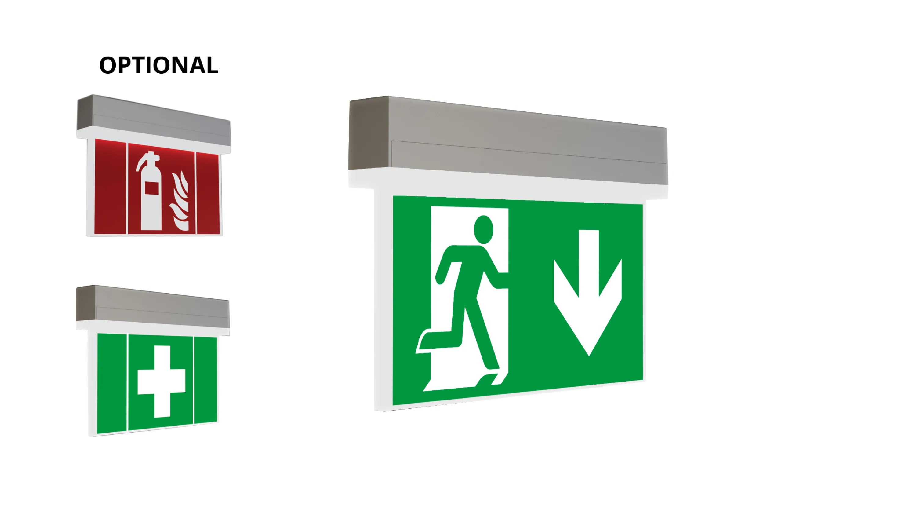 Innovative Kunststo? Rettungszeichen- und Sicherheitsleuchte für Universalmontage. Geeignet zur ein- oder zweiseitigen Beschriftung, sowie Beleuchtung von Brandbekämpfungs- als auch von Erste Hilfe Stellen, mit den nach EN 1838 min. geforderten 5 Lux an der Einrichtung. Durch den Verrastmechanismus zwischen Ober- und Unterteil wirkt die Leuchte harmonisch und rundum geschlossen. Der Netzanschluß erfolgt im Deckenanbaukörper, beim Schließen der Leuchte erfolgt die Versorgung der Leuchte über Steckkontakte. Dies erleichtert ungemein die Montage und ermöglicht trotz der geringen größe der Leuchte einen bequemen Anschluß. Kabelllose zentrale Steuerung und Überwachung für große Installationen von bis zu 50.000 Leuchten mit Wireless Professional. Planungssicherheit wird durch logisch vorgegebene aufgedruckte Piktogramme geboten. Die Piktogramme entsprechend DIN ISO 7010 (Pfeil rechts, links und unten) sind standardmäßig im Lieferumfang enthalten. Auf Anfrage kann die Beschriftung auch nach Kundenvorgabe erfolgen. Die Universalmontage beinhaltet Wand- und Deckenanbau, sowie die Möglichkeit zum Deckeneinbau in Verbindung mit dem erhältlichen Einbaurahmen.