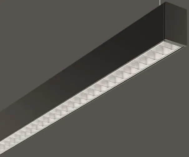 Pendelleuchte in minimalistischem Design. Gehäuse Aluminium-Strangpressprofil pulverbeschichtet. Endkappen Aluminium pulverbeschichtet. Aluminium-Mikroraster glänzend. Hervorragend geeignet für Bürobereiche (UGR < 19) und Bildschirmarbeitsplätze (BAP) gem. DIN EN 12464-1. Lichtaustritt direkt 60%, indirekt 40%. Geeignet für Pendel. 2-Punkt Stahlseilabhängung stufenlos höhenverstellbar oder gewünschte Sonderlängen auf Anfrage. Betriebsgerät extern mit Verbindungsleitung.