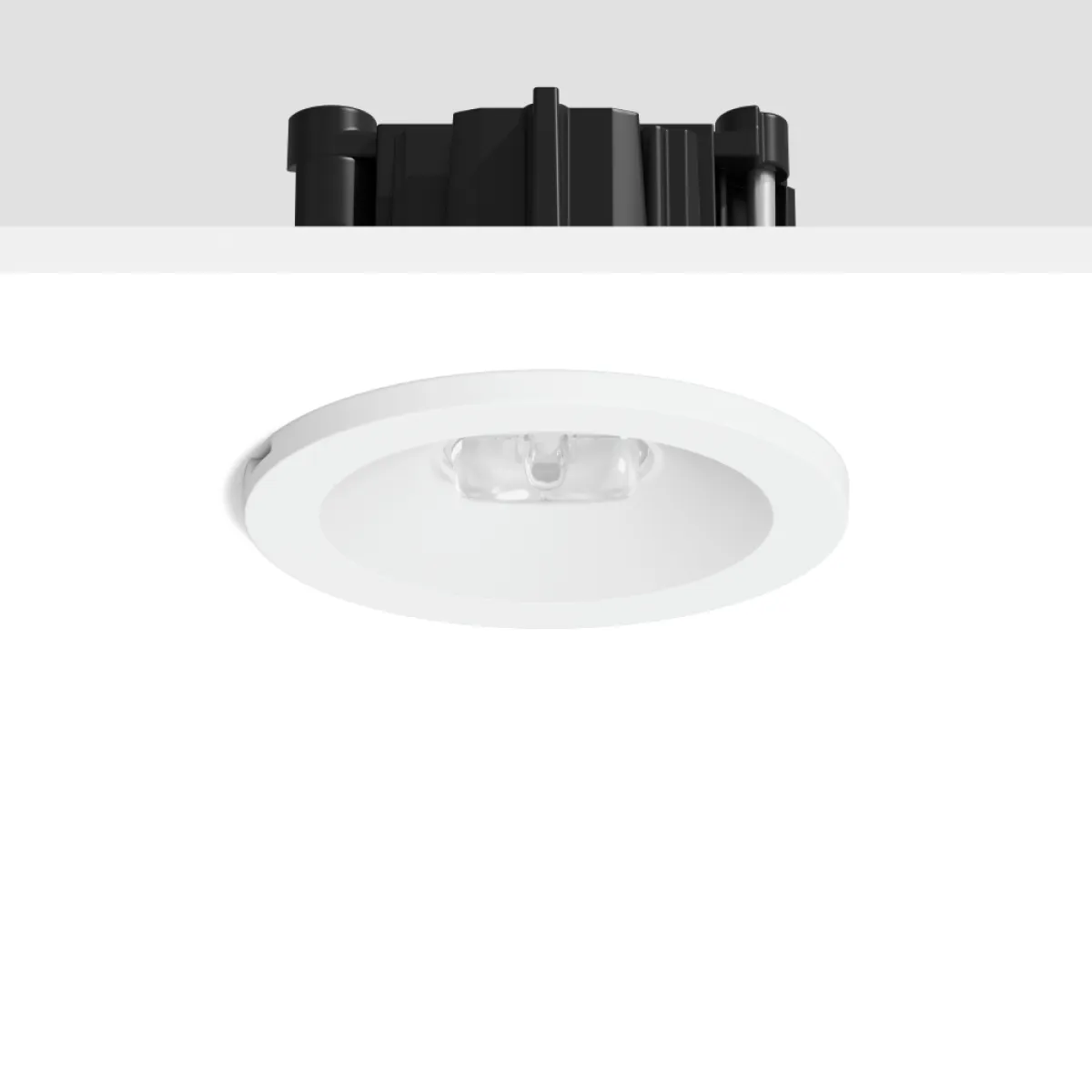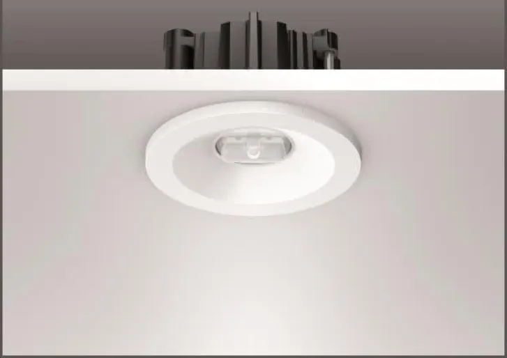 Runde Sicherheitsleuchte zur Rettungswegbeleuchtung. Gehäuse Aluminium-Druckguss. Abdeckring Kunststoff. Mit Kunststofflinsen zur Rettungswegbeleuchtung. Einzelbatteriesystem mit automatischem Selbsttest. Mit beiliegendem separaten Deckeneinbauring auch für Deckenausschnitte von ø 68 mm geeignet.