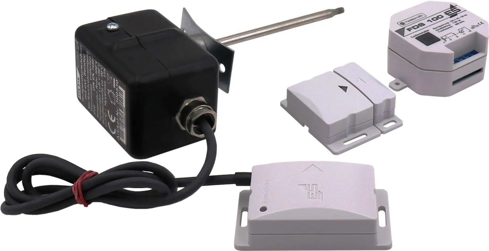 Durch den Einsatz des Funk-Temperaturwächters FTX 519 am Ofenrohr und abgesetztem Sender in Ofennähe kann eine Abluftanlage nur dann benutzt werden, wenn der Ofen bzw. die Verbrennungsstätte nicht läuft und kalt ist oder ein Fenster geöffnet wurde. Ein Sender, verbunden mit 1 Meter langem Silikonkabel am Temperaturwächter überwacht, ob der Ofen brennt oder aus ist und übermittelt diese Information per Funk an den Empfänger. Dieser gibt die Stromzufuhr für das angeschlossene Gerät nur dann frei, wenn der Ofen aus ist. Ist der Ofen an, kann die Abluftanlage weiterhin mit einem geöffneten Fenster in Betrieb genommen werden. Zur optimalen Funkübertragung wird der Sender des FTX 519 mit einem Silikonkabel aus dem heißen Ofenbereich herausgeholt und in Richtung Empfänger zeigend aufrecht an einer Wand montiert. Eine kapazitätsstarke Lithium-Batterie sorgt für lange Betriebsdauer. Zusatzsender für 2. Fenster: Um eine Wahl zwischen zwei Fenstern zu haben (ODER-Funktion), besteht die Möglichkeit, einen Zusatzsender FDS 098 gleichen Codes zu verwenden, der ab Werk programmiert wird. 2. Empfänger: zum bestehenden Set kann ein weiterer Empfänger (Einbau FDS 199 oder Zwischenstecker FDS 299) angesteuert werden. Sobald der Ofen kalt ist oder ein Fenster geöffnet wurde, schalten beide Empfänger das jeweils angeschlossene Gerät frei. Technische Daten Empfänger: Betriebsspannung: 230 V/50-60 Hz, Leistungsaufnahme: ca. 5,5 W, Schaltleistung Relais: 1150 VA/5 A, Funkfrequenz: 868 MHz, Reichweite: bis 20 m im Freifeld, Funktionsbereich: -15 °C/+40 °C, Schutzart: IP 20, Empfänger (HxBxT): 53x53x31 mm, Technische Daten FTX: Schaltschwelle: 40 Grad +/- 7K, ca. 15 K Hysterese, max. Fühlertemperatur: 500 °C, max. Umgebungstemperatur: 180 °C, max. Kabeltemperatur: 180 °C, max. Sender-Temperatur: 50 °C, Reaktionszeit: unter 45 Sek., Montage: 3 Bohrungen im Rauchrohr (muss von Fachfirma montiert werden), FTX Abmessungen (LxBxH): 183x68x85 mm, Sender Abmessungen (LxBxH):73x38x21 mm, Batterie im Lieferumfang. Technische Daten Fensterkontakt-Sender: Schaltschwelle: bis max. 0,5 cm zum Magnet, Reaktionszeit: unter 0,5 Sek., Montage: Befestigung an Fensterrahmen und -flügel, Abmessungen Sender (LxBxH): 55x31x18 mm, Abmessungen Magnet (LxBxH): 55x15x18 mm, Frequenz: 868 MHz SRD, Reichweite: bis zu 20 m im Freifeld, abh. von Installation, Batterie im Lieferumfang