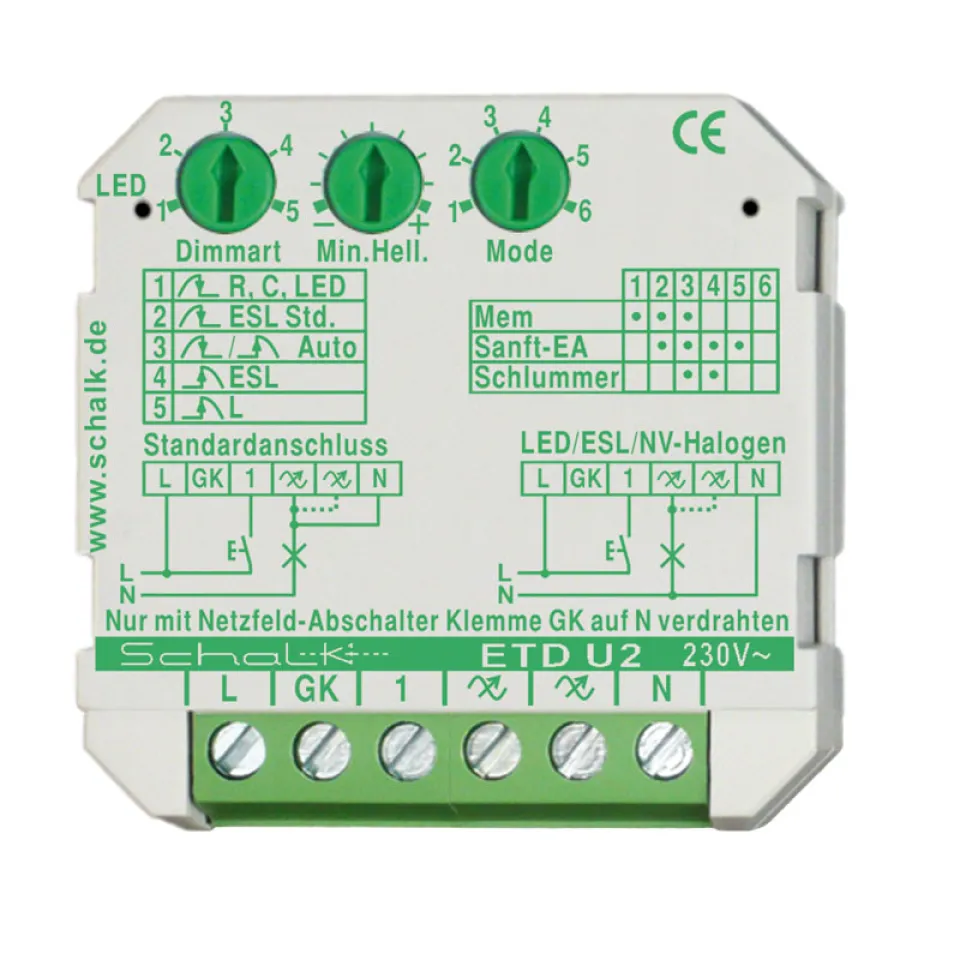 Maximale Flexibilität für Sie als Bauherr, Renovierer oder Profi: Mit dem Schalk Universal Tastdimmer ETD U2 bekommen Sie ein echtes Multitalent, das sich Ihrer vorhandenen Elektroinstallation optimal anpasst. Die präzise Steuerung der Lichtintensität sorgt für perfekte Wohnatmosphäre – von entspannter Stimmung im Wohnzimmer bis zur funktionalen Ausleuchtung im Arbeitsraum.