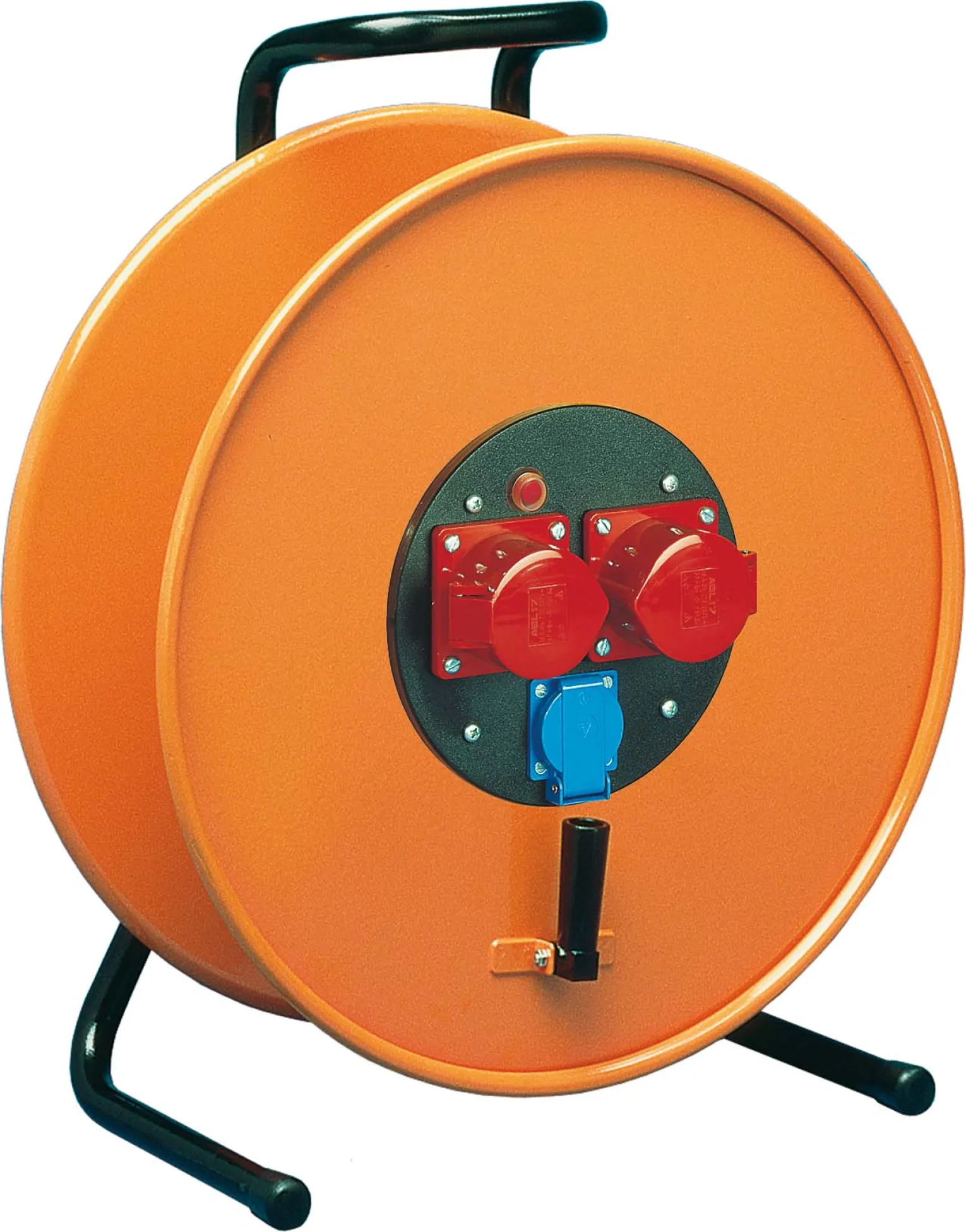 Kabeltrommel mit 2 CEE-Dosen 5x16A und 1 Schutzkontakt-Steckvorrichtung.