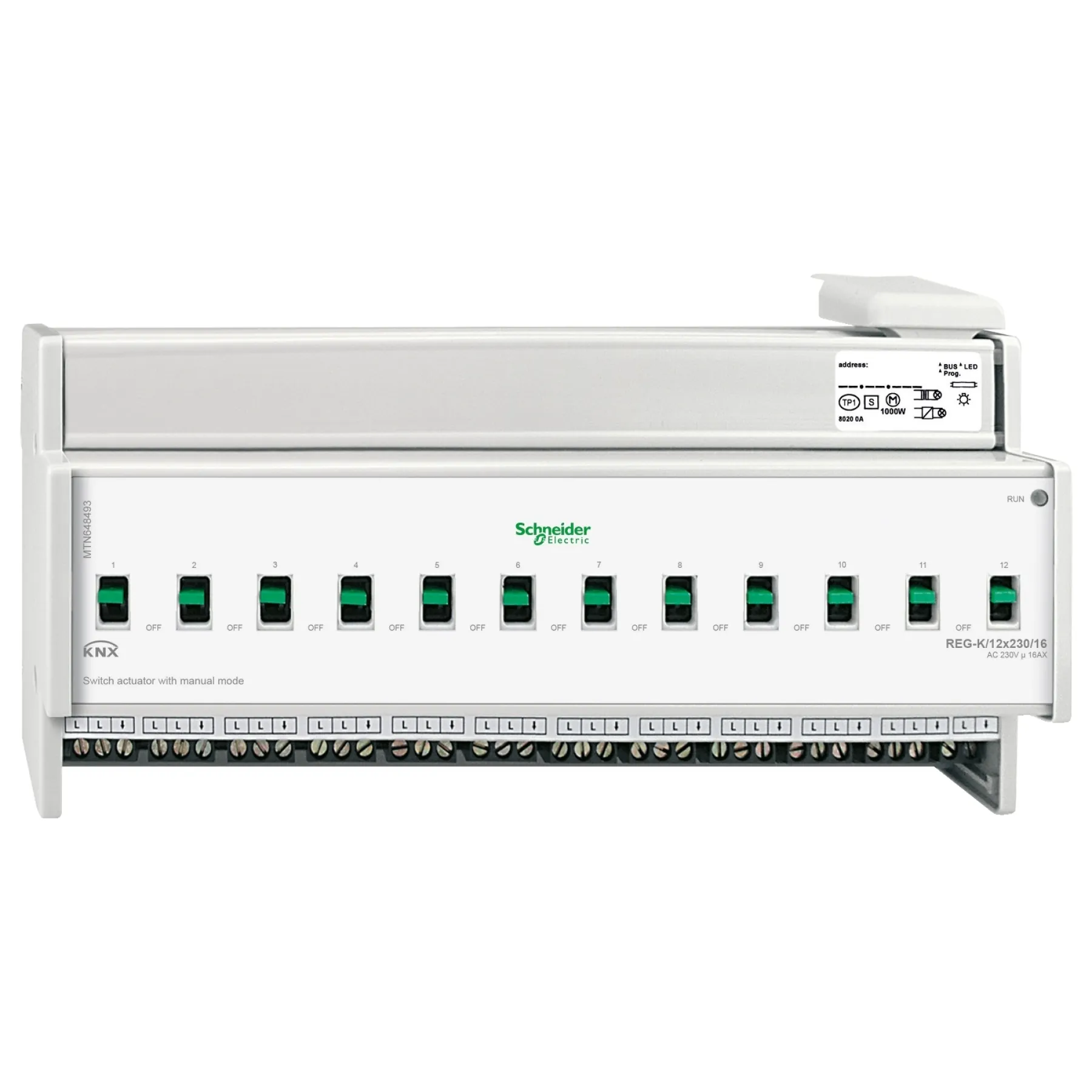 Der Schneider Electric KNX Schaltaktor REG 12TE 12-fach 16A (MTN648493) ist die ideale Lösung für die intelligente Steuerung von bis zu 12 elektrischen Verbrauchern in modernen KNX-Systemen. Ob Beleuchtung, HLK-Anwendungen oder Stellantriebe – dieser leistungsstarke Schaltaktor sorgt für zuverlässige und flexible Automatisierung in Wohn- und Zweckbauten.