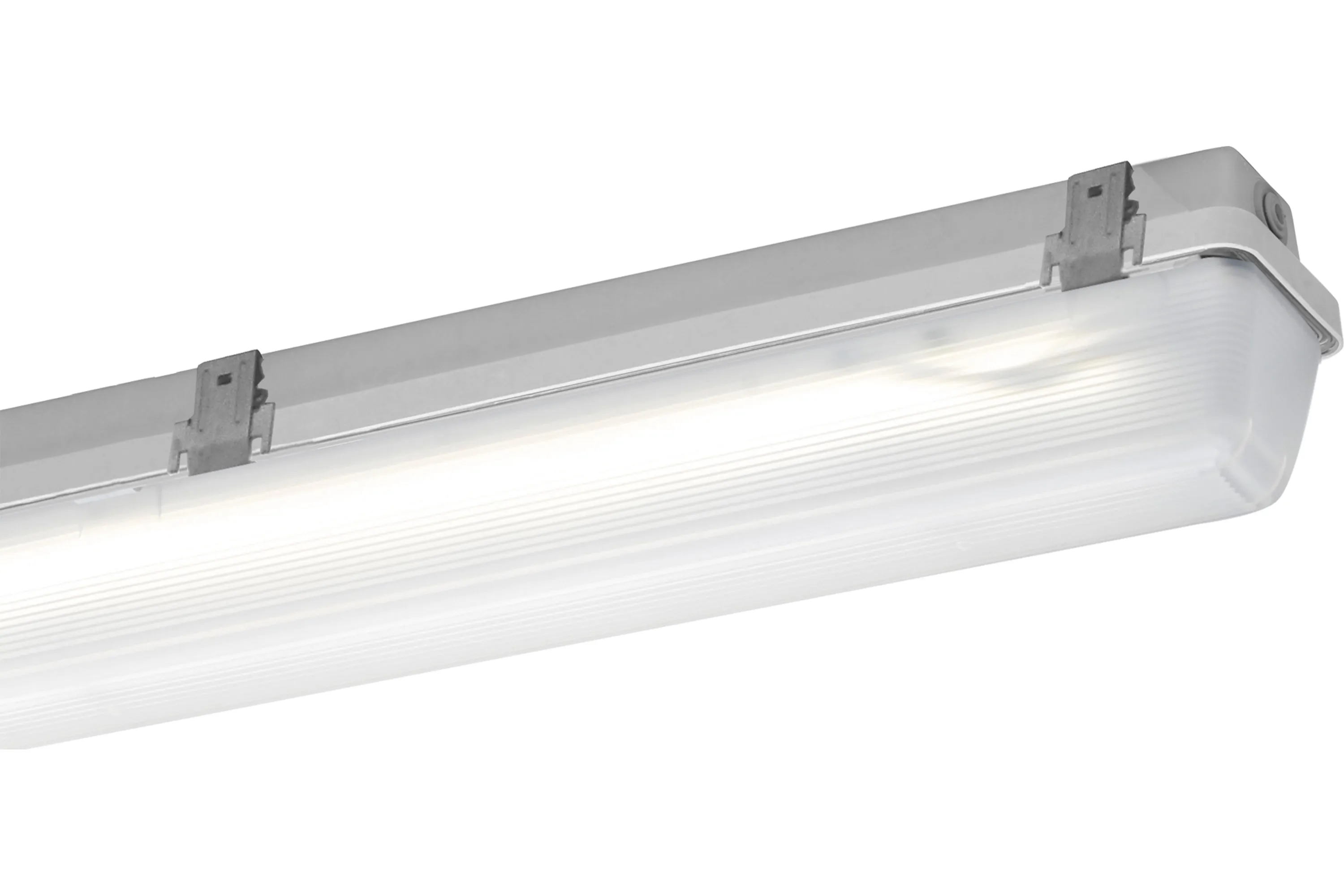 LED-Feuchtraum-Wannenleuchte, 21 W, 3440 lm, SKI, IP65, symmetrisch-breitstrahlend, 4000 K, Ra= 80, Ta -20 °C/+40 °C, L70>100000 h (@ Ta max), L80>70000 h (@ Ta max), L90>50000 h (@ Ta 25°C), Wanne PC satiniert, Verschluss Edelstahl (1.4571), Gehäuse glasfaserverstärktes Polyester, Farbe grau, für Lebensmittelbereiche, EAN/GTIN:4041254267456.Robuste LED-Feuchtraum-Wannenleuchte für Lebensmittelbereiche gem. International Featured Standard Food. Hochschlagfestes glasfaserverstärktes Polyestergehäuse, satinierte PC-Abschlusswanne mit hoher Schlagfestigkeit. Mehrteilige unverlierbare Edelstahlklammern, davon zwei Sicherheitsverschlüsse, Silikondichtung. Lackierter Aluminiumreflektor mit hocheffizienten Zhaga-konformen LED-Modulen und EVG mit Überlast- und Kurzschlussschutz.