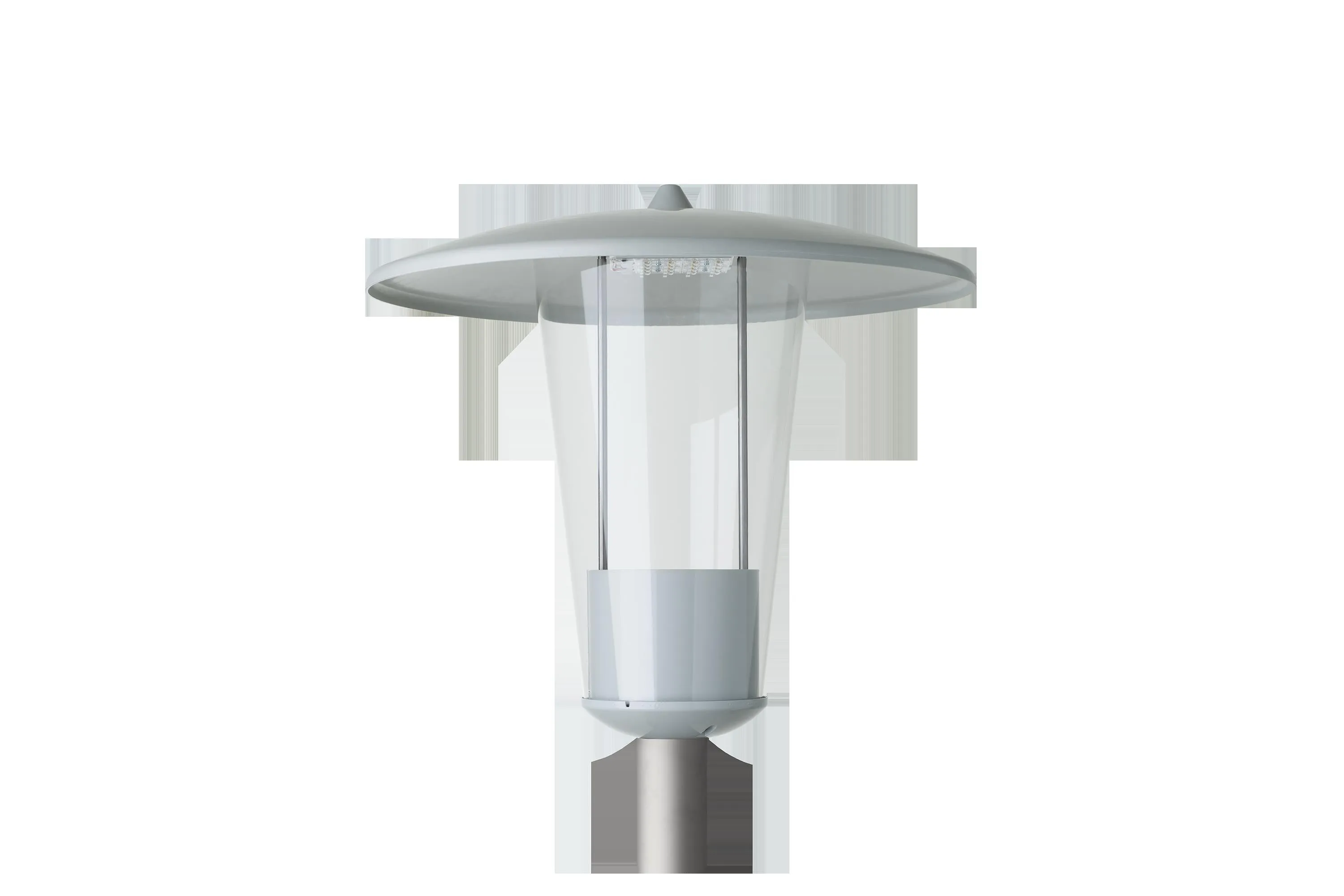 LED-Pilzleuchte, RETRO, 13 W, 1650 lm, SKII, IP54, rotationssymmetrisch-strahlend, 3000 K, Ra= 70, Ta -40 °C/+35 °C, L90>100000 h (@ Ta max), Konus PMMA klar, Leuchtendach (Polyester), Gehäuse Aluminium, Lackiert, Farbe grau, RAL 7035, Achtung: Leuchte besteht aus 3 Packstücken (Masteinheit, Glas und Dach), Lieferzustand: teilmontiert!, EAN/GTIN:4041254394244.Klassische LED-Pilzleuchte RETRO, bestehend aus glasfaserverstärktem Polyesterdach, pulverlackiertem Mastfuß aus Aluminium und klarem, konischem PMMA-Glas. LED-Modul und EVG-Einheit anschlussfertig verdrahtet, Trennsteckverbindung zur Netzanschlussklemme und Zugentlastung für Anschlusskabel. Zhaga konforme LED-Module mit hocheffizienten Optiken, direkt strahlend, Multi-Layer Technologie. EVG mit hoher Stoßspannungsfestigkeit, Überlast- und Kurzschlussschutz. Befestigung auf geraden Lichtmasten Ø 76mm (bei Ø 60mm siehe "