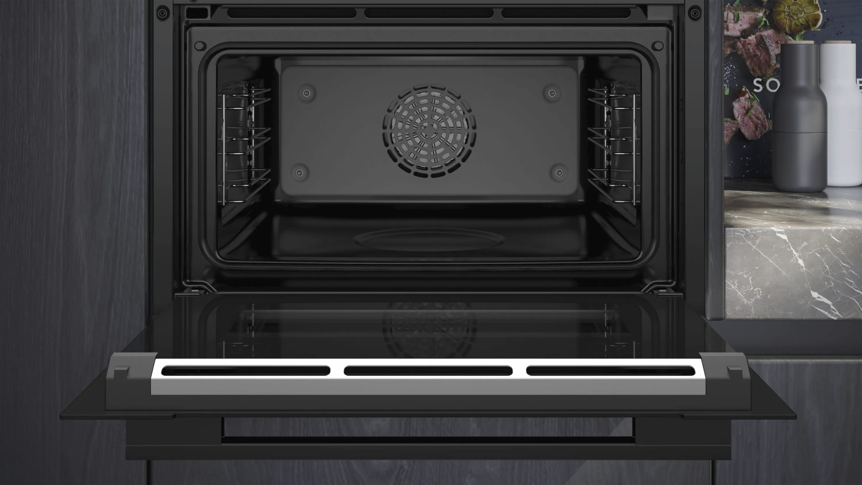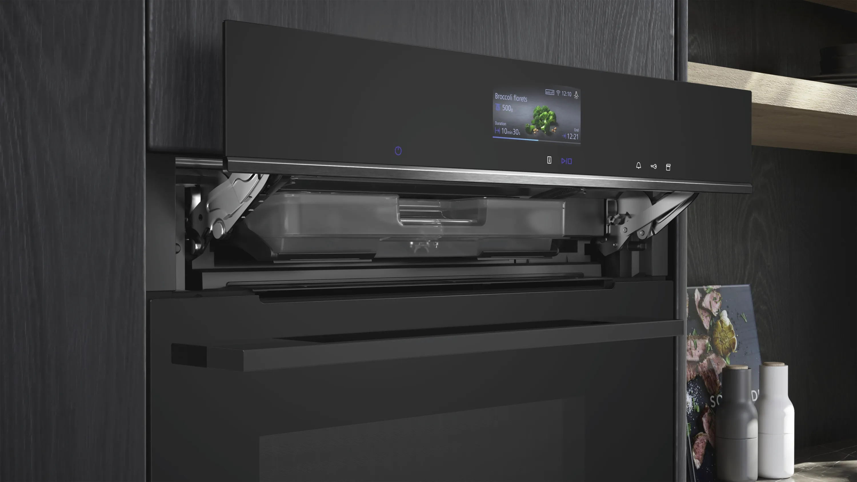 Dank cookControl Pro gelingen Ihnen automatische Brat- und Backprogramme auf Knopfdruck. Die coolStart-Funktion ermöglicht schnelles Zubereiten von Tiefkühlgerichten ohne Vorheizen – für mehr Zeit und weniger Energieverbrauch. Das elegante Schwarz mit anthrazitfarbenem Email-Garraum und sanft schließender Klapptür fügt sich harmonisch in jede moderne Küche ein.