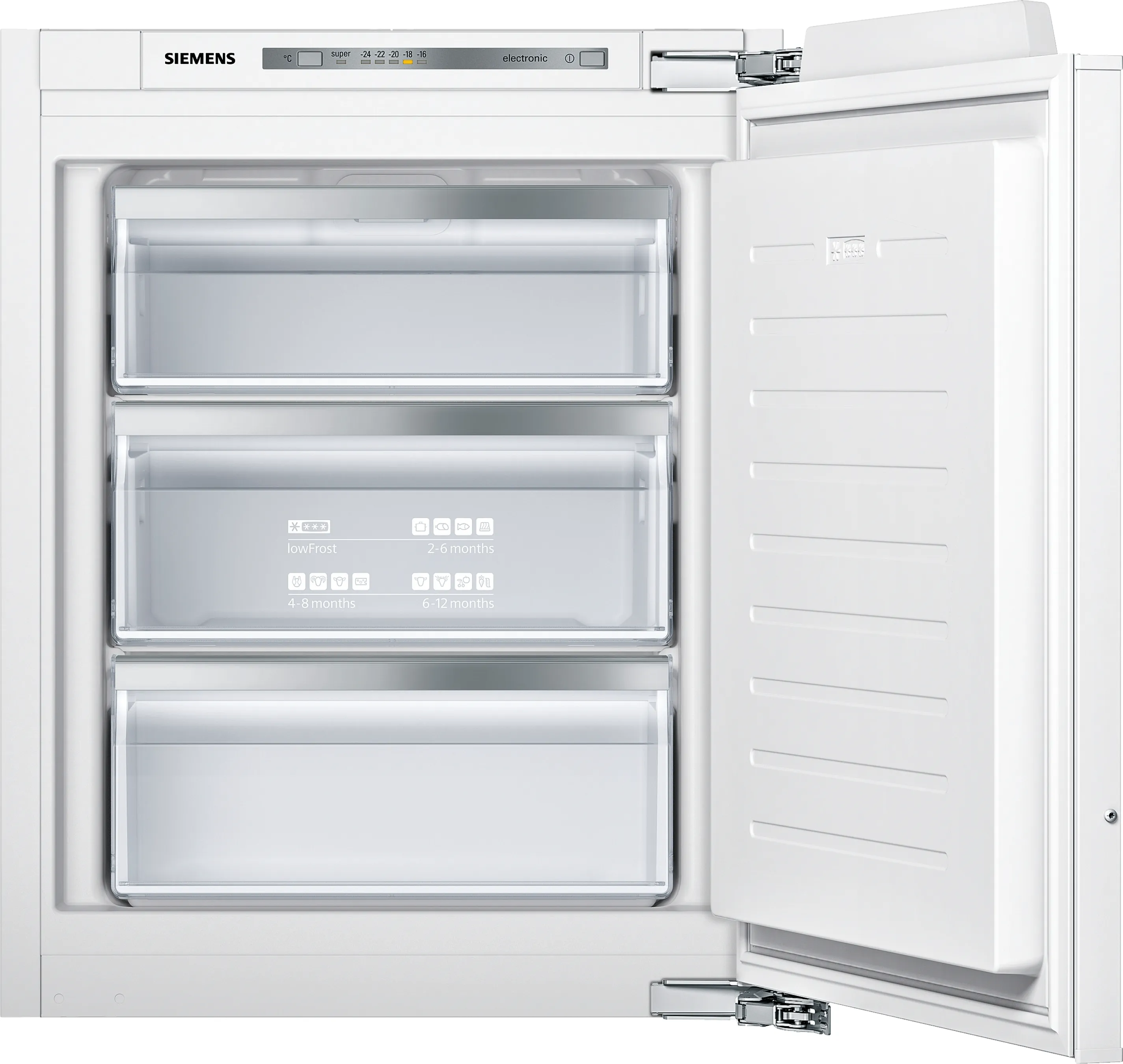 Mit einem Gesamtnutzinhalt von 72 Litern und drei transparenten Gefriergutschubladen bietet der Siemens Gefrierschrank ausreichend Platz für Vorräte, Eis und Tiefkühlprodukte. Dank seines integrierbaren Designs fügt sich das Gerät nahtlos in jede Küchenzeile ein und passt perfekt in Nischen mit einer Höhe von 72 cm.