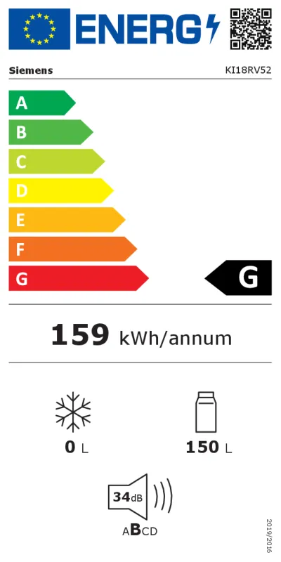 | Energieeffizienzklasse Die Skala der Energieeffizienzklasse reicht von A (höchste Effizienz) bis G (geringste Effizienz) | G |