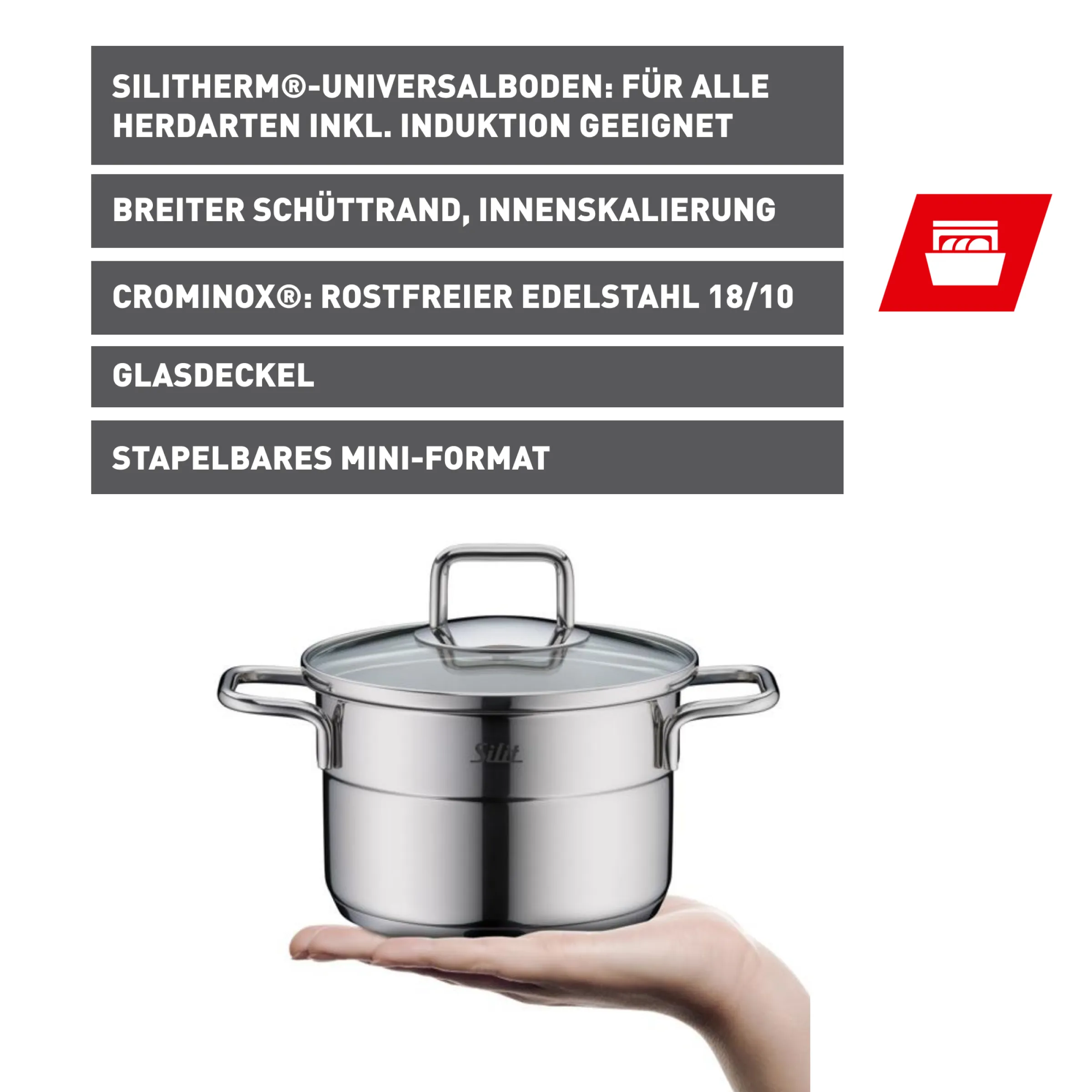 Der Silit Extra Cook Mini-Kochtopf 14 cm mit Glasdeckel ist die platzsparende Lösung für jeden Haushalt und ideal für alle, die köstliche Mahlzeiten in kleinen Mengen zubereiten möchten. Dank hochwertigem Crominox®-Edelstahl und funktionalem Design überzeugt dieser Mini-Topf nicht nur durch Langlebigkeit, sondern auch durch exzellenten Kochkomfort – ob für Singles, kleine Familien oder Meal-Prepping-Fans.