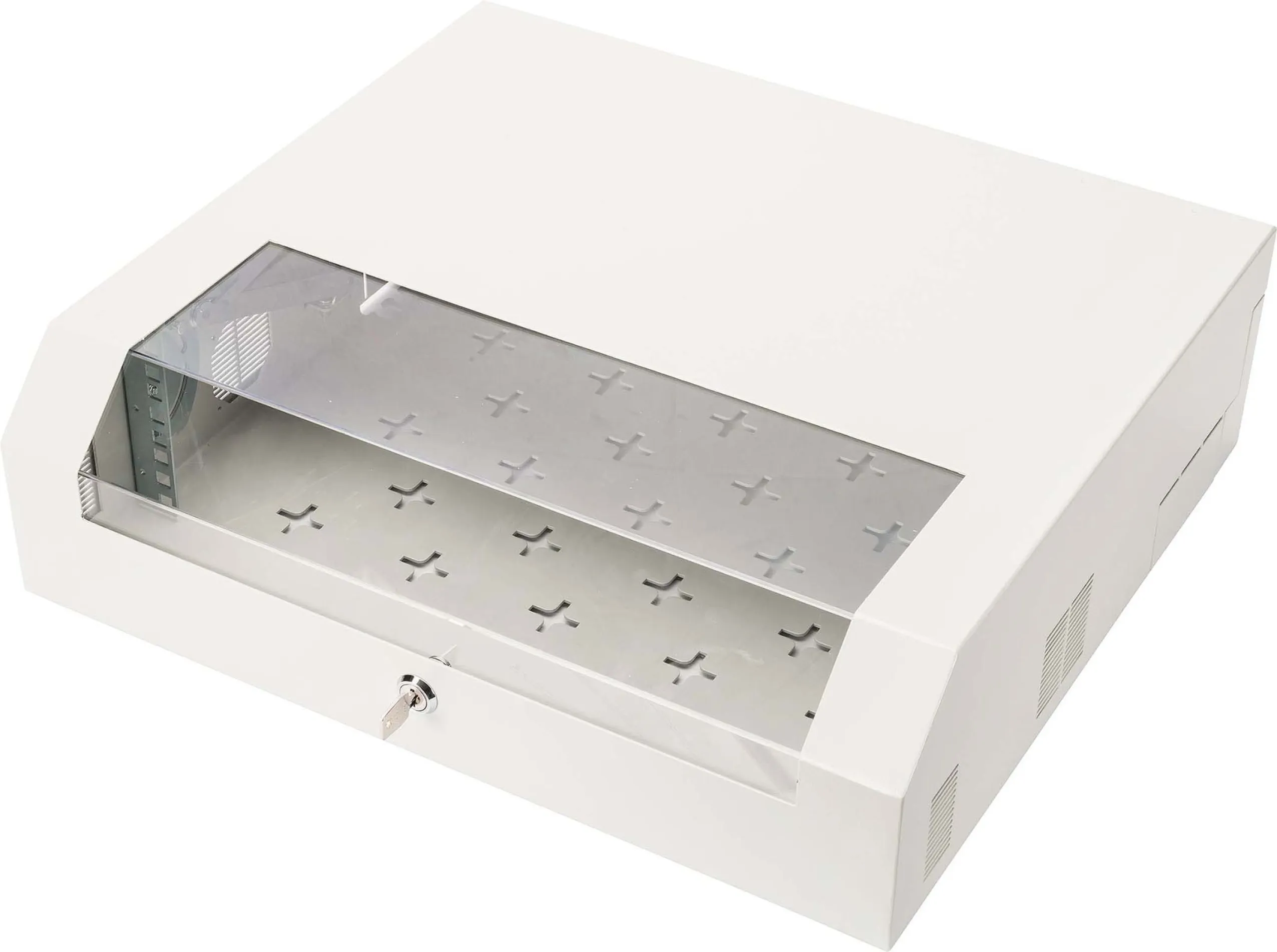 Das Wandgehäuse überzeugt durch hochwertige Verarbeitung aus robustem Stahlblech und eine pulverbeschichtete Oberfläche, die vor Kratzern und Korrosion schützt. Die kompakte Bauweise (145 x 500 x 474 mm) nutzt den vorhandenen Raum optimal aus und ermöglicht die Installation auch bei begrenztem Platzangebot.