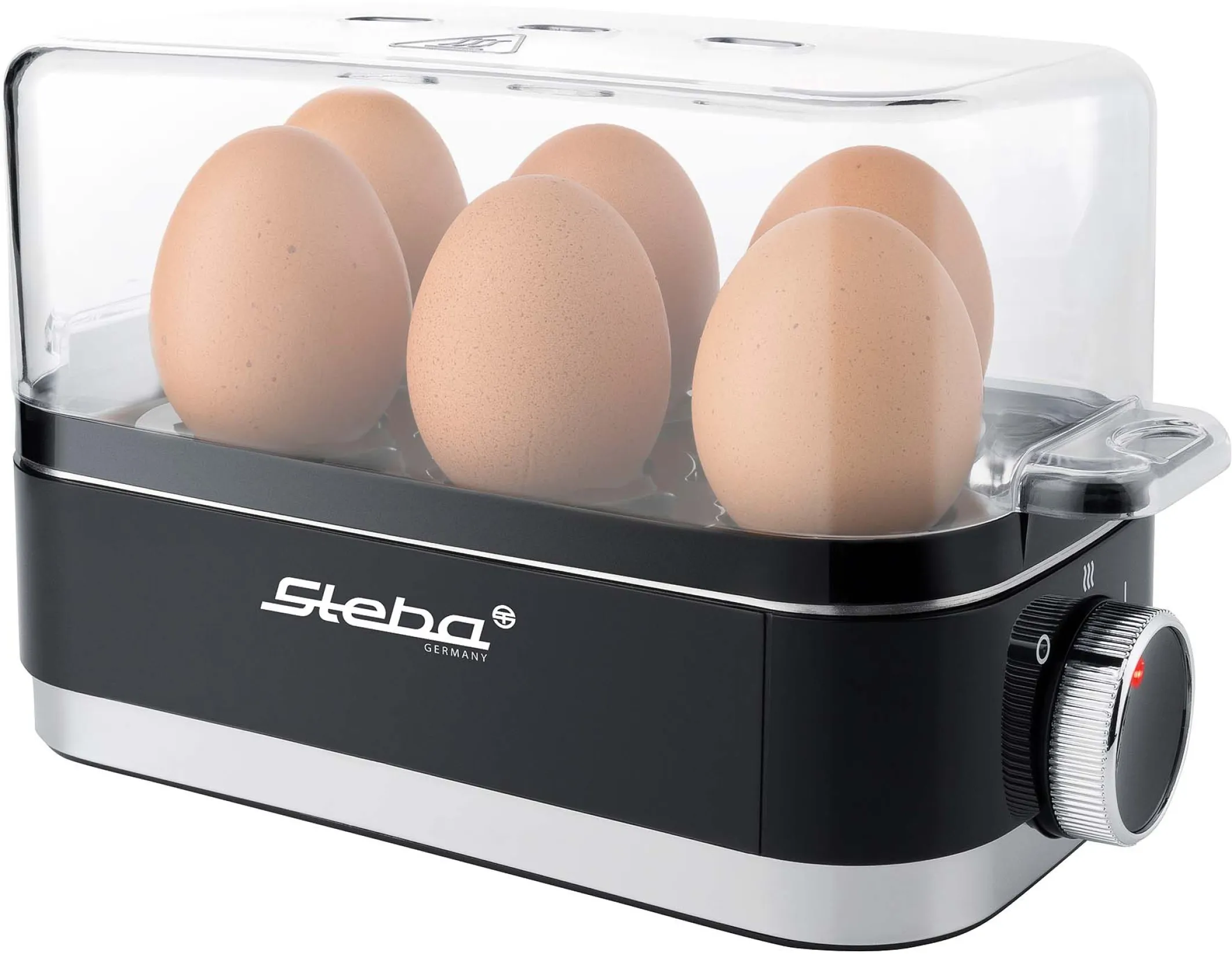 Für max. 6 Eier, Edelstahlkochschale, Pochiereinsatz, Warmhaltefunktion, Eiertray mit Tragegriffen, Betriebskontrollleuchte, Messbecher zur Kochgradeinstellung, Eierpick, Klarsichthaube