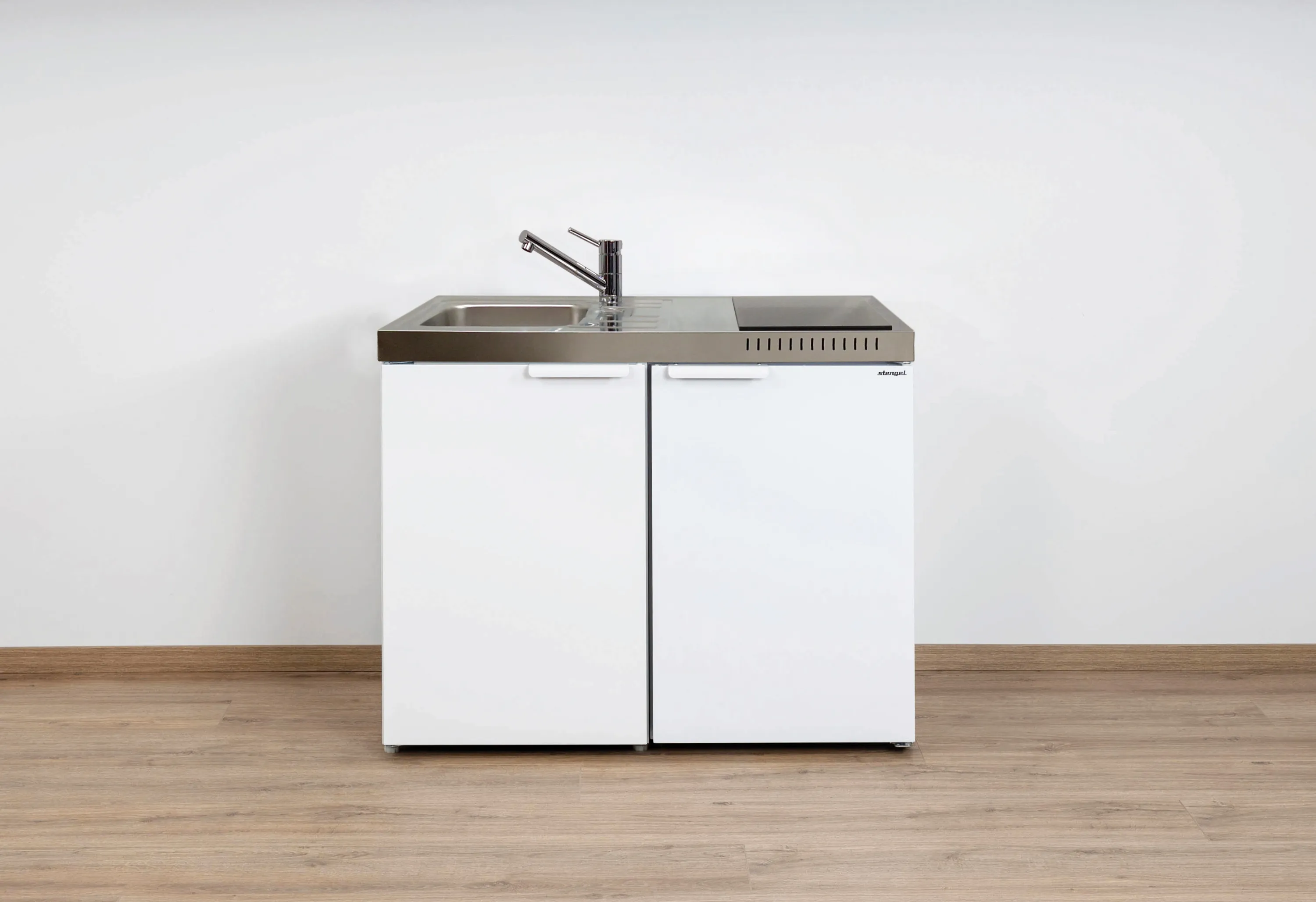 Ob im City-Apartment, Studenten-Zimmer oder im modernen Büro: Die Stengel Miniküche Kitchenline weiß bietet alle wichtigen Küchenelemente auf kleinstem Raum. Kochen, Spülen und Kühlen – alles komfortabel integriert. Die hochwertige Verarbeitung aus Metall und Edelstahl garantiert Langlebigkeit und mühelose Reinigung, während das elegante Weiß harmonisch zu allen Wohnstilen passt. Machen Sie Ihren Alltag einfacher und genießen Sie den Luxus einer vollwertigen Küche auf nur 1 Meter Breite!