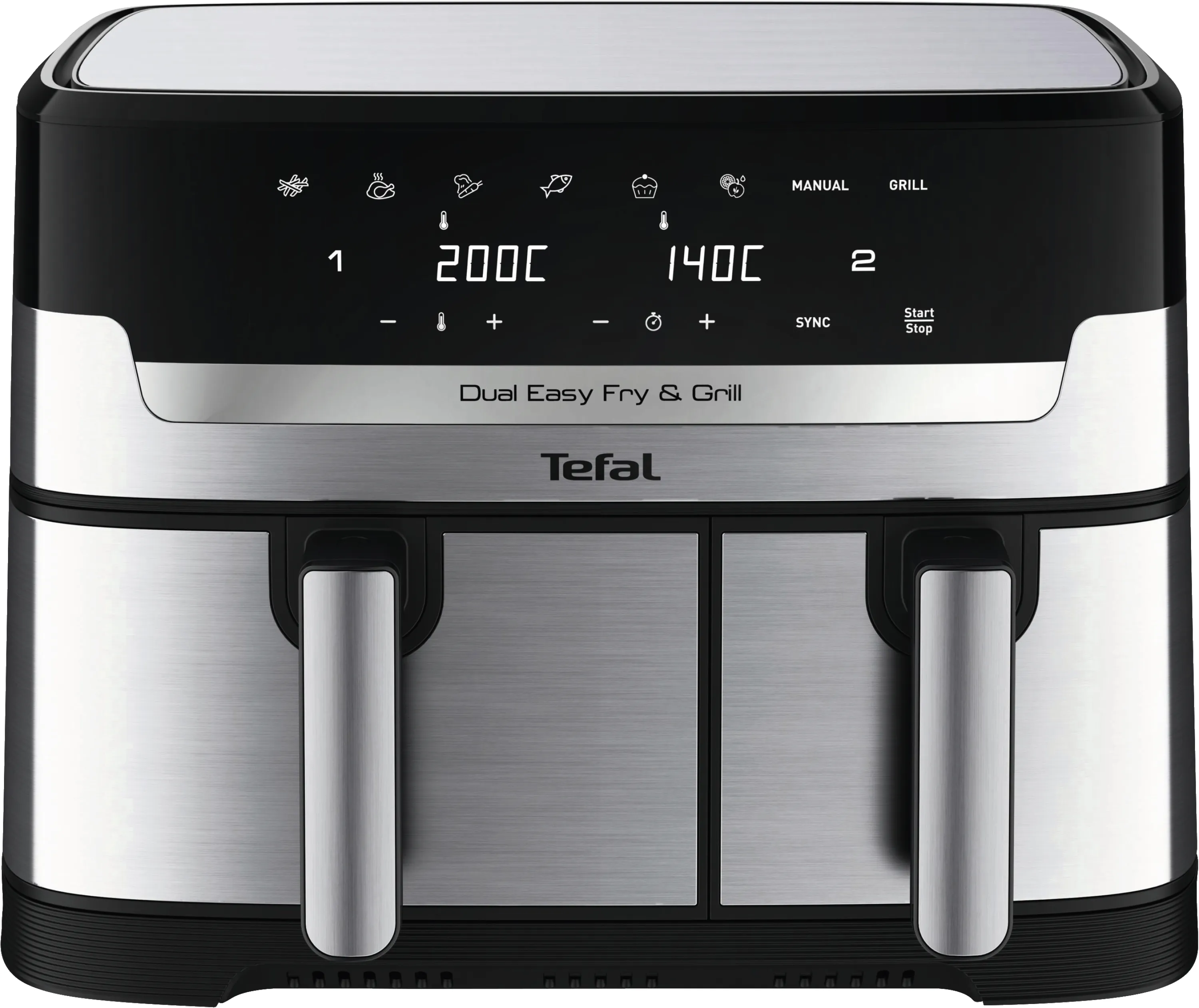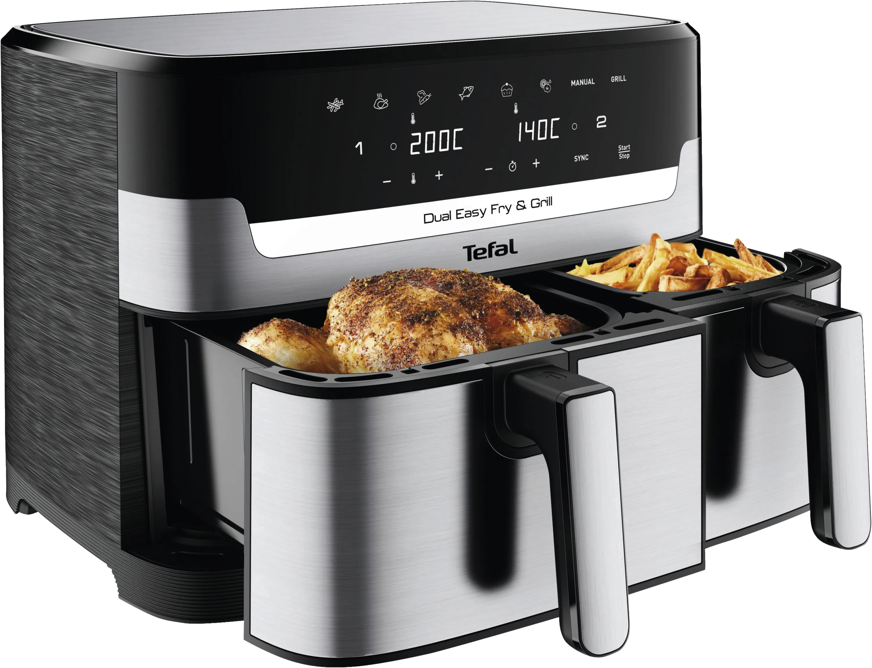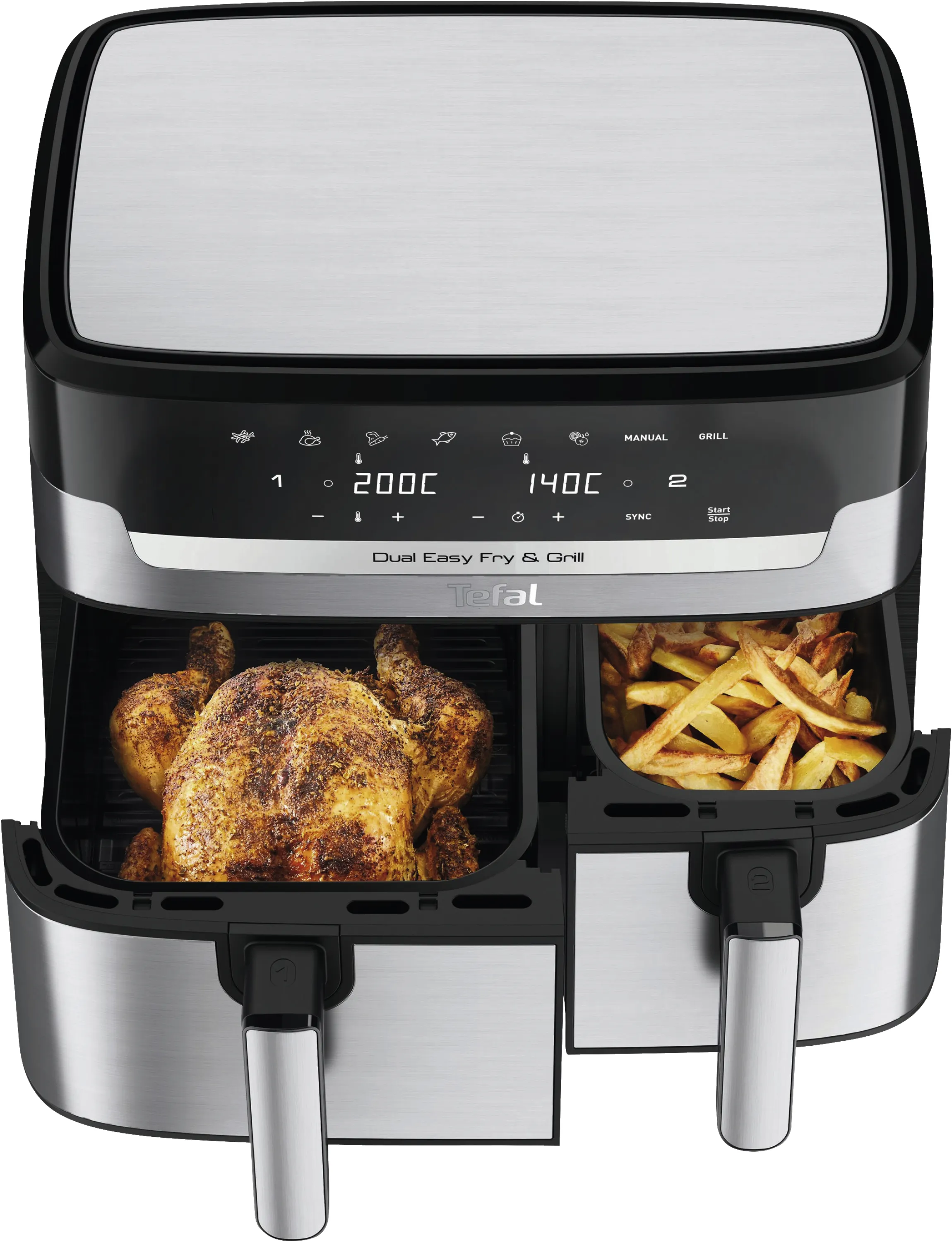 Genießen Sie gesunde und schmackhafte Gerichte im Handumdrehen – ob als Familie, im Homeoffice oder bei geselligem Beisammensein. Dank der dualen Zonen brennt nichts an und alles ist zur gleichen Zeit servierbereit. Überzeugen Sie sich selbst vom Unterschied, den eine hochwertige Doppel-Heißluftfritteuse in Ihrer Küche macht. Holen Sie sich kulinarische Vielfalt, Zeitersparnis und Genuss in einem – mit der Tefal EY905D Dual Easy Fry & Grill!