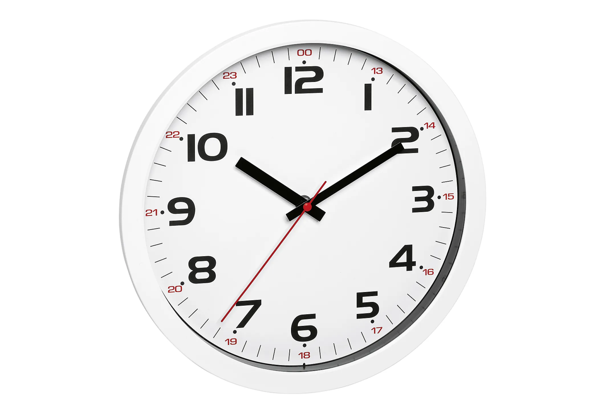 Die moderne analoge Wanduhr überzeugt durch ihr klares, kontrastreiches Design in Weiß, Schwarz und signalstarkem Rot. Sie ist ein optisches Highlight an jeder Wand und sorgt mit ihrer innovativen Skala dafür, dass Sie nie mehr überlegen müssen, ob 13 Uhr oder 1 Uhr gemeint ist.