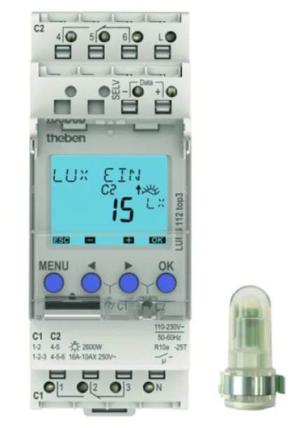 Der Theben LUNA 112 top3 EL Dämmerungsschalter mit Einbaulichtsensor bietet eine zuverlässige und effiziente Lösung für die automatische Lichtsteuerung nach Umgebungshelligkeit. Mit moderner Technik, präzisem Einbaulichtsensor und intuitiver App-Programmierung sorgt dieses Gerät für bedarfsgerechte Beleuchtung – ideal für Außen- und Innenbereiche.