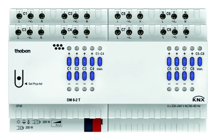 Der Theben DM 8-2 T KNX Universal-Dimmaktor bietet Ihnen modernes, flexibles und zuverlässiges Dimmen für Ihre KNX-Smart-Home-Installation. Mit acht unabhängig steuerbaren Kanälen eignet sich dieser Dimmaktor ideal für Wohngebäude, Büros und gewerbliche Objekte, in denen individuelle Lichtsteuerung gefragt ist.