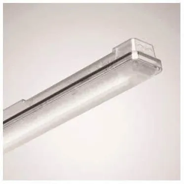 Dank Schutzart IP66 ist die Leuchte staubdicht und gegen starkes Strahlwasser geschützt. Das robuste Gehäuse aus schlagfestem Kunststoff (IK08, lichtgrau ähnlich RAL 7035) eignet sich optimal für raue Umgebungen und feuergefährdete Bereiche. Die prismierte PC-Abdeckung gewährleistet eine breite, symmetrische Lichtverteilung (direkt/indirekt 85 %/15 %) und eine natürliche Farbwiedergabe (Ra ≥ 80).