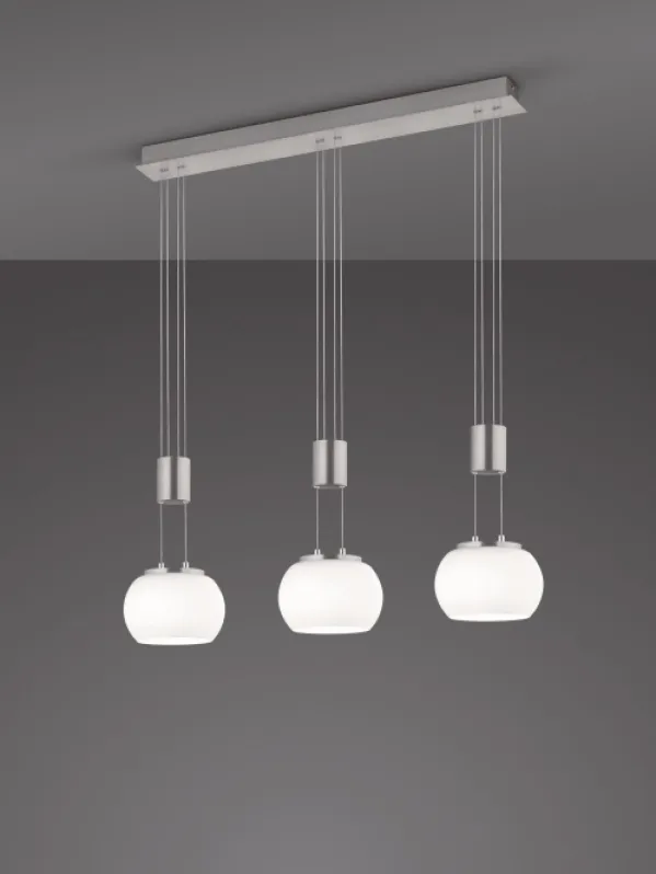 Pendelleuchte mit Switch-Dimmer, extern nicht dimmbar, hohenverstellbar 1/2- oder 3-flammig lieferbar LIeferbare Farben:Nickel - Glas Weiss, Messing Glas Weiss, Schwarz Glas Weiss, Schwarz-Glas Chrom bedampft