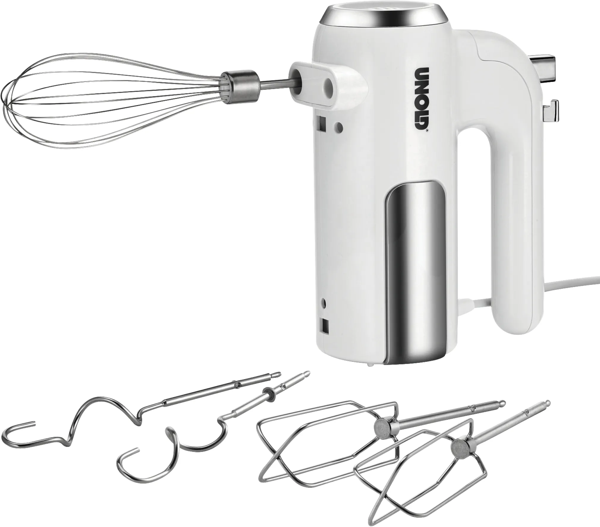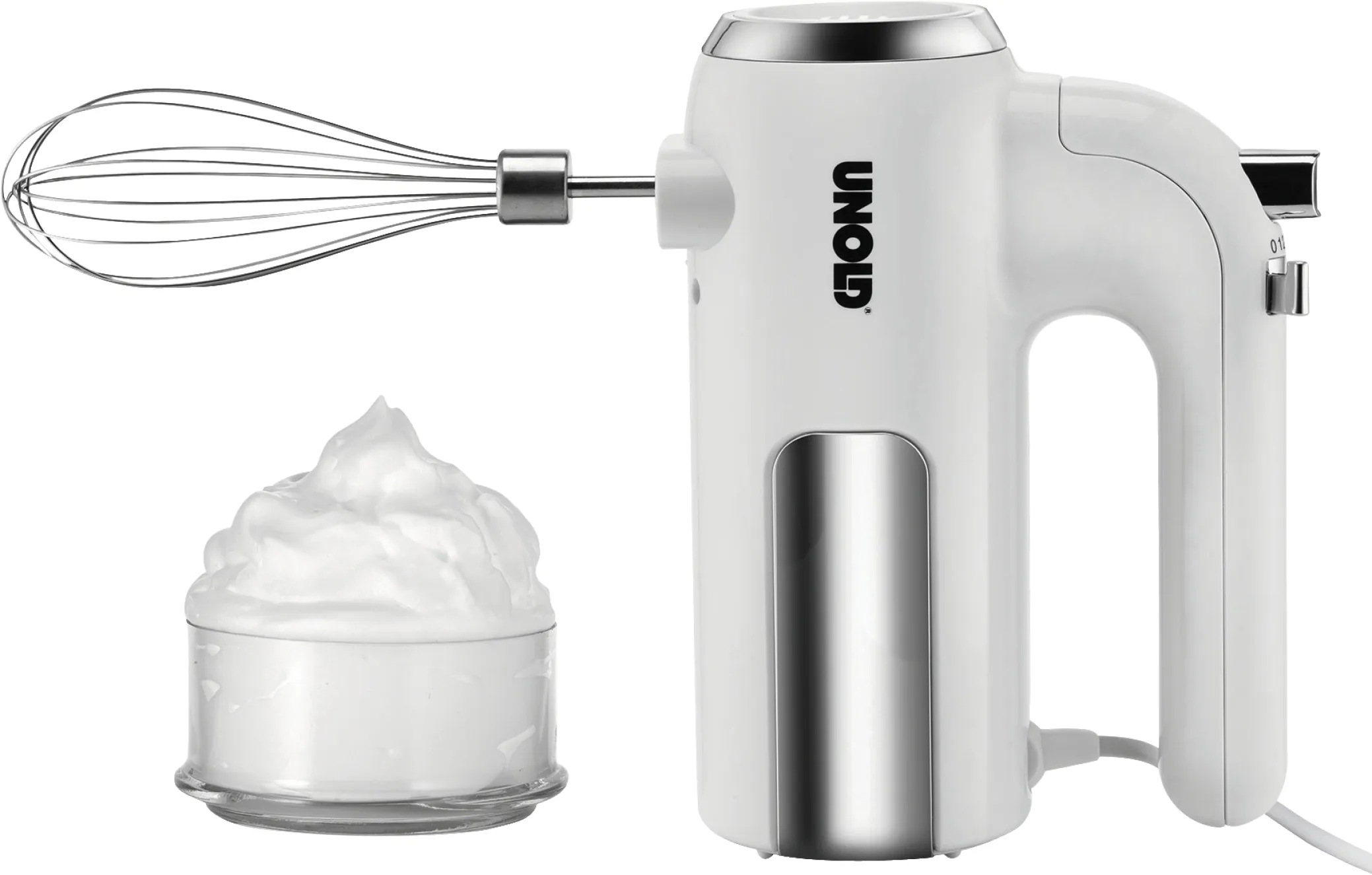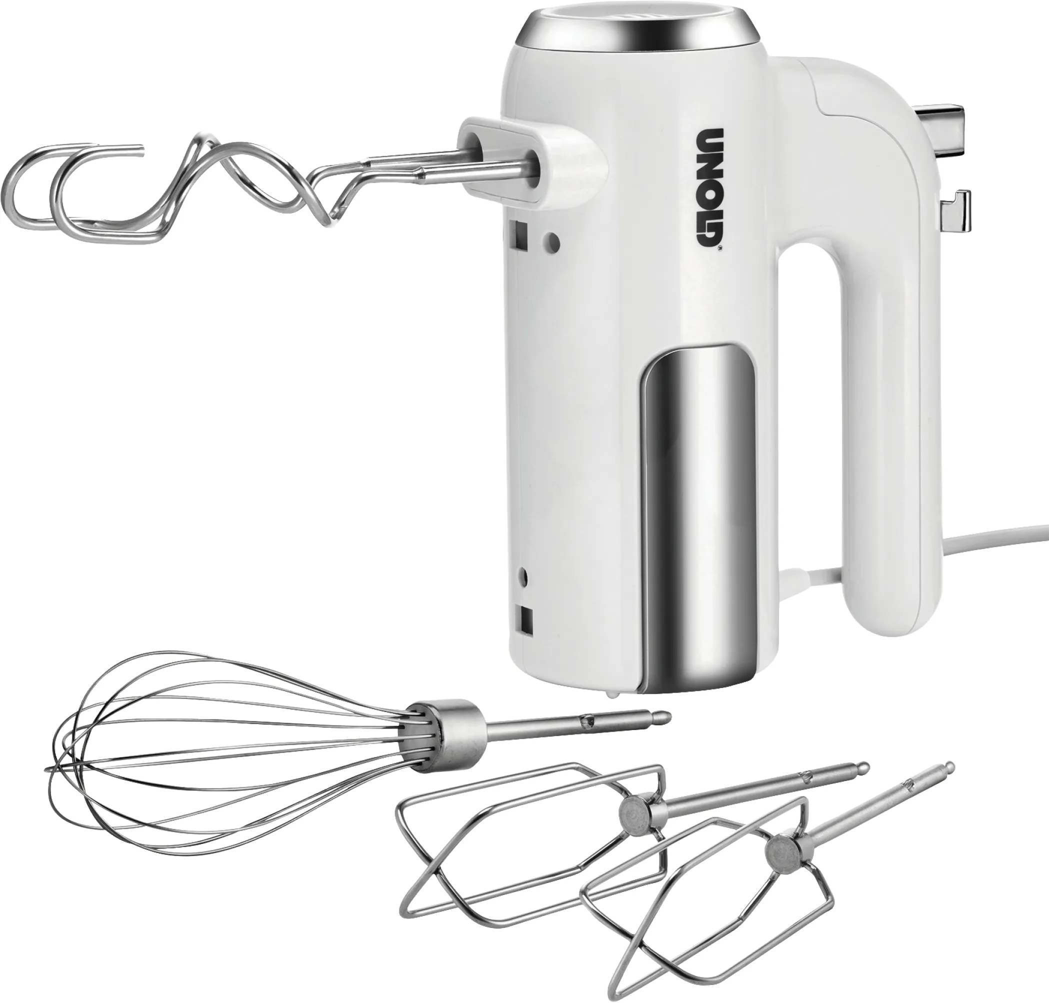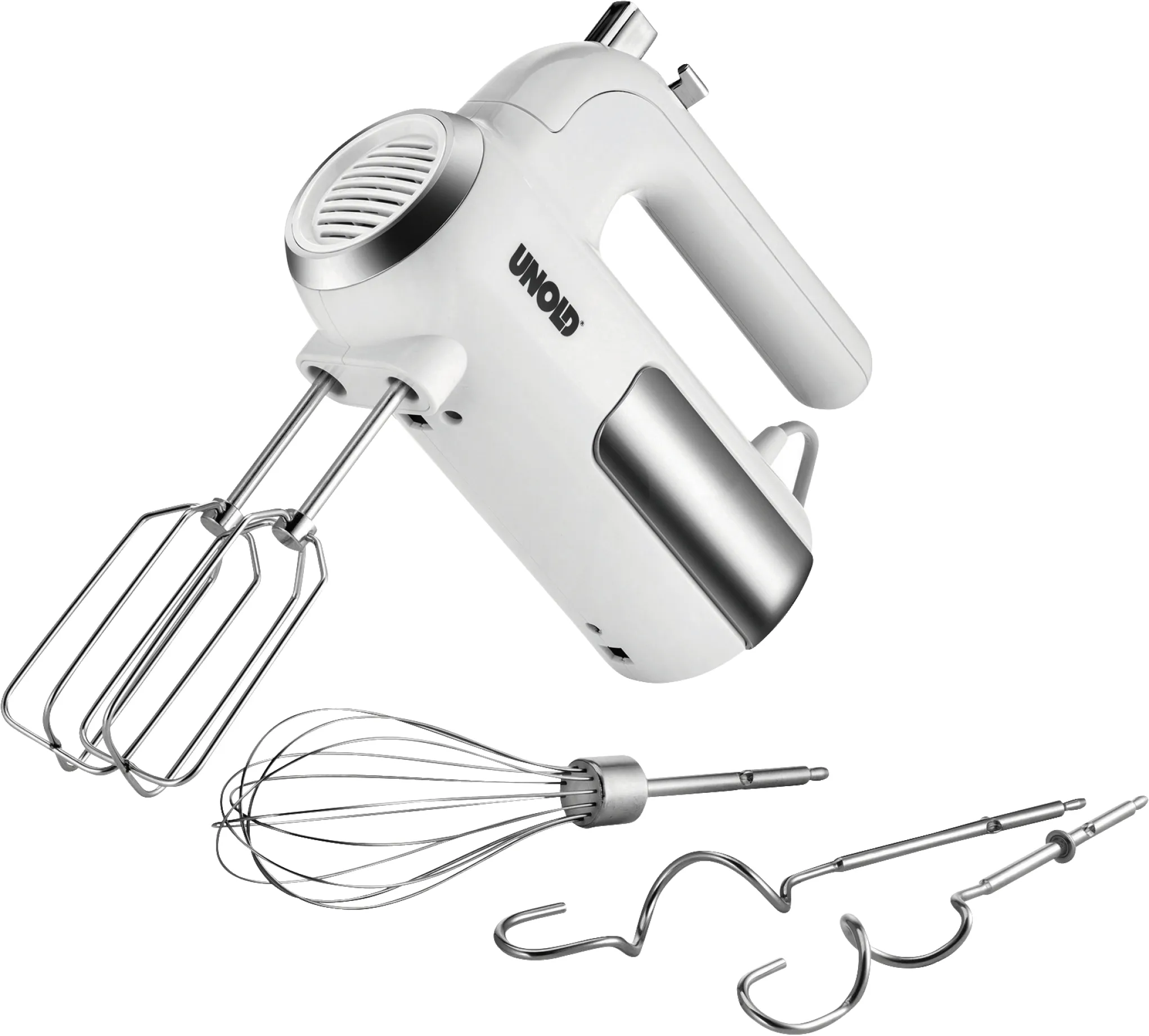 Ob luftiger Biskuit, herzhafter Pizzateig oder cremige Desserts – mit dem UNOLD Handmixer gelingen alle Rezepte spielend leicht. Das zeitlose Design in Weiß und Edelstahl passt in jede Küche und macht diesen Mixer zum täglichen Begleiter. Durch das einfache Handling eignet sich das Gerät auch perfekt als Geschenk für Kochanfänger oder zum Einzug.