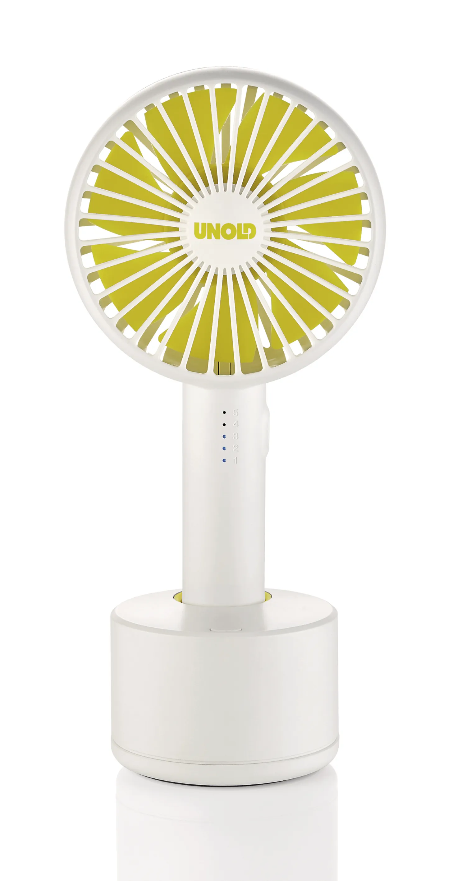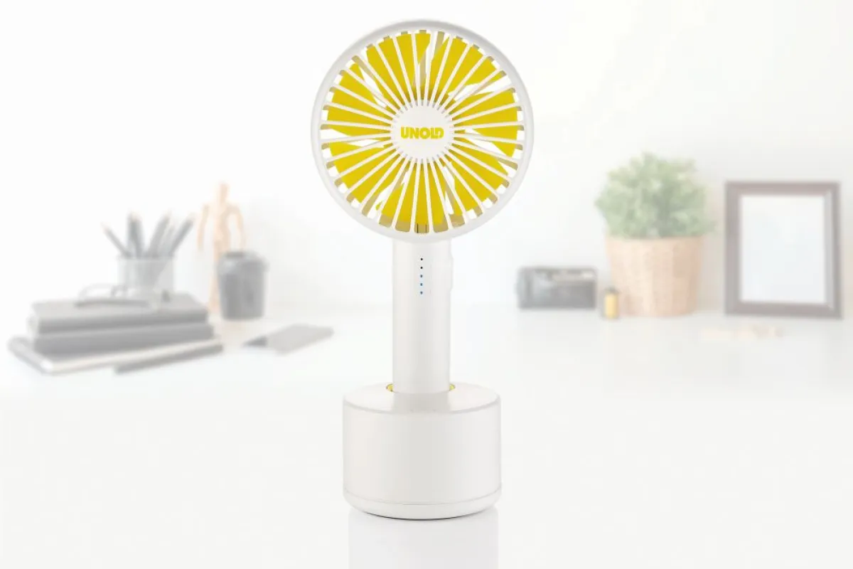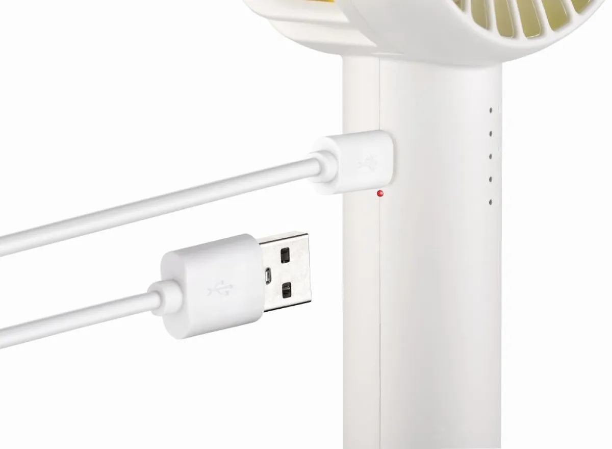 Akku-Handventilator (2000 mAh), bei Verwendung mit Sockel ein Tischventilator mit Oszillation (120°), 5 Geschwindigkeitsstufen mit LED-Kontrollleuchte, Akkubetrieb je nach Stufe 2 - 2,5 - 3 - 4 und 8 Std., Ladezeit 3 Std., Ladestrom DC 5/1000 mA, 2 USB-Anschlüsse kann mit Handy, PC, oder Power Bank verbunden werden, magnetischer Standfuß, Ein-Ausschalter, inkl. Micro-USB-Kabel