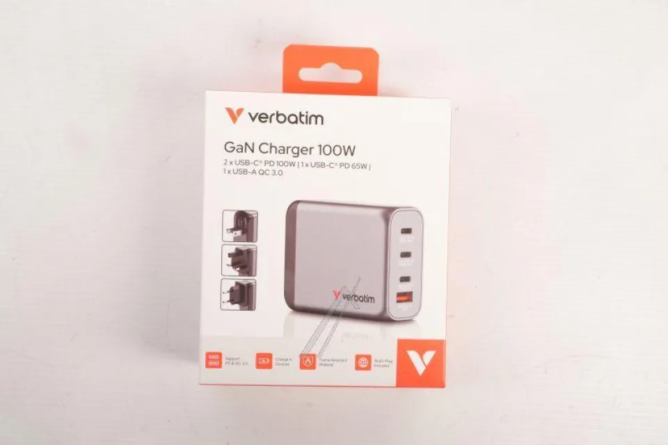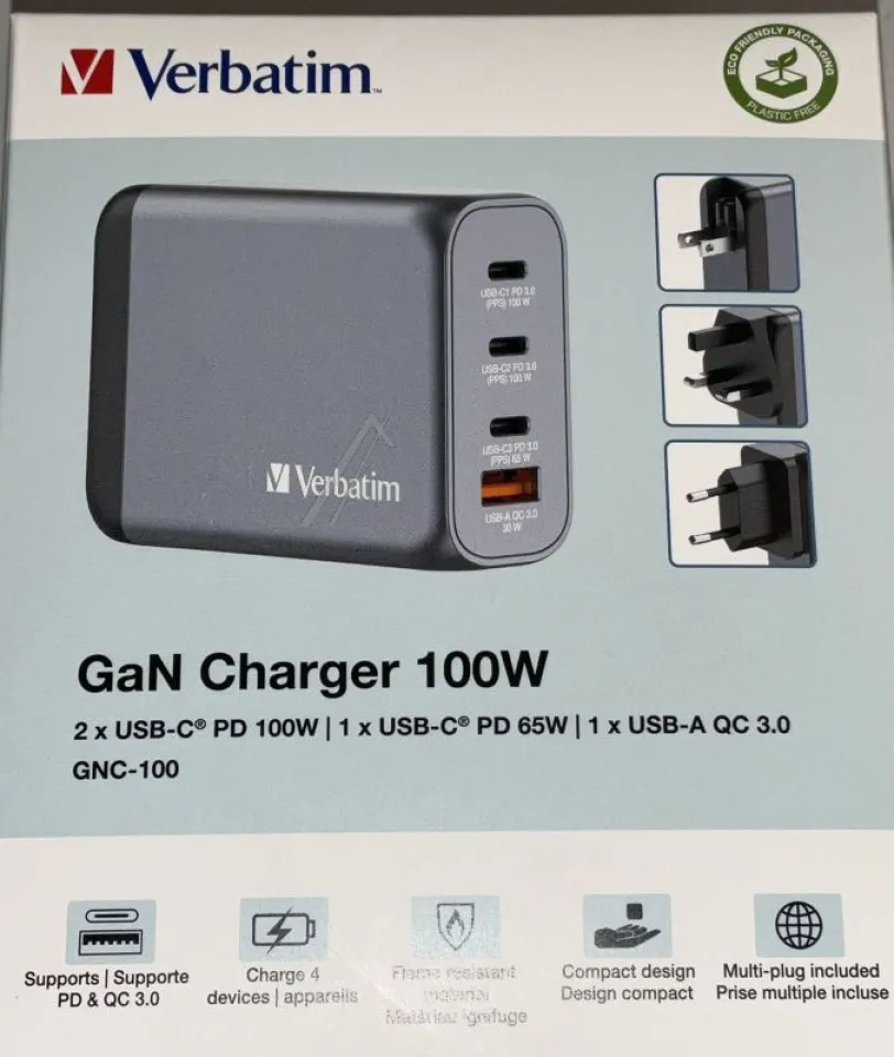 Das Verbatim GNC-100 GaN-Ladegerät bietet maximale Ladeleistung in einem handlichen und leichten Format. Ausgestattet mit moderner Galliumnitrid(GaN)-Technologie und insgesamt vier leistungsstarken Ladeanschlüssen, ermöglicht dieses Universal-Ladegerät das gleichzeitige, schnelle Aufladen von Laptops, Smartphones, Tablets und weiteren Geräten – zu Hause, im Büro oder auf Reisen.