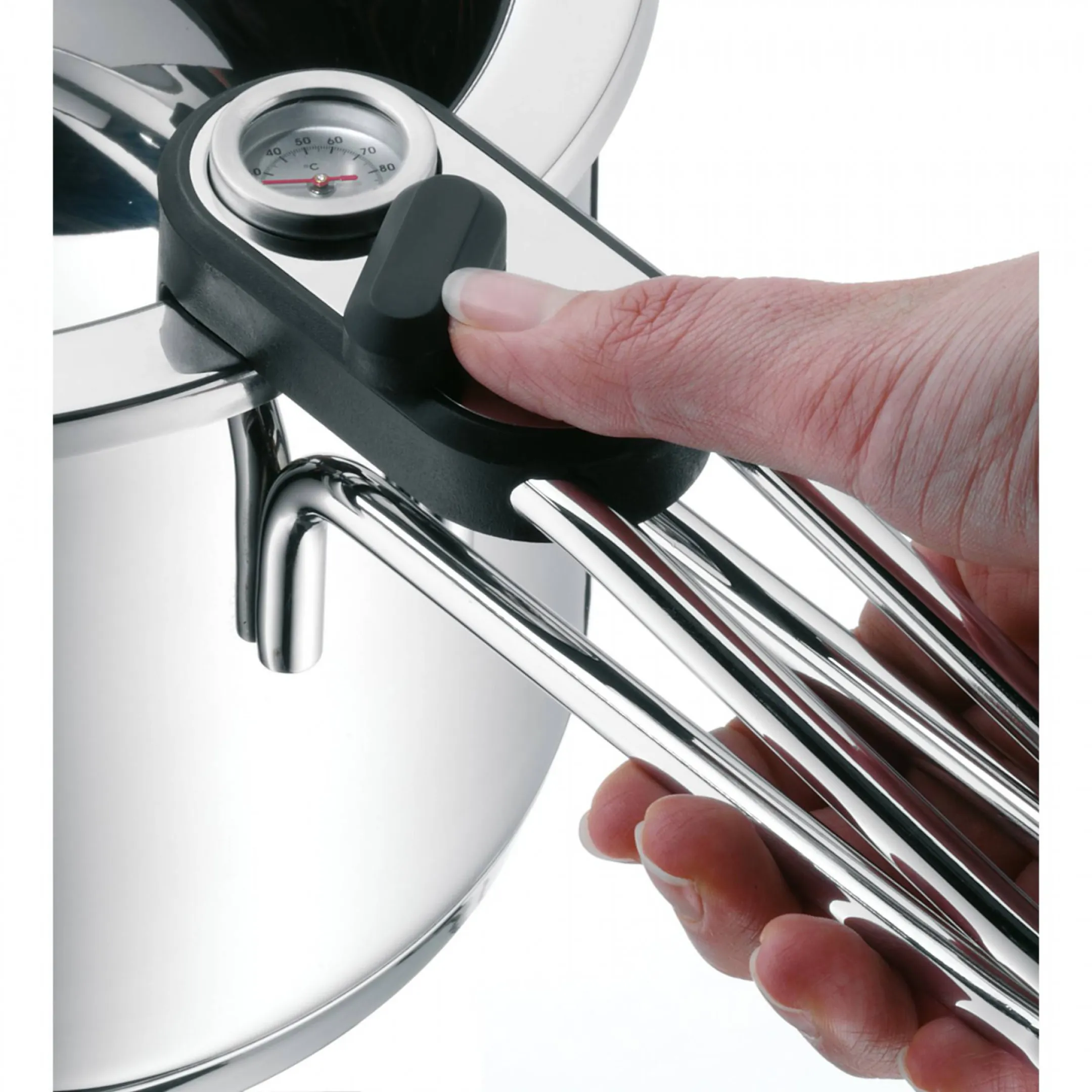 Mit dem WMF Simmertopf mit Temperaturanzeige gelingt Ihnen die schonende Zubereitung empfindlicher Speisen spielend leicht – Schluss mit angebrannter Milch oder überkochendem Pudding! Profitieren Sie von der cleveren Wasserbad-Technologie, die perfekte Temperaturkontrolle und entspanntes Kochen ermöglicht.