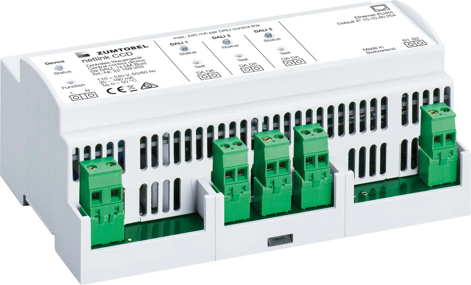 Das Zumtobel Netlink CCD DALI Gateway ist speziell für die Integration in moderne Schalt- und Verteilerschränke konzipiert. Dank durchdachtem Design und intuitiver Netzwerkanbindung lässt sich das Gerät einfach installieren und konfigurieren. Die flexible Adressierung und Gruppenzuordnung ermöglicht eine übersichtliche Verwaltung Ihrer Lichtsysteme – ganz ohne physischen Zugriff auf die einzelnen Betriebsgeräte.
