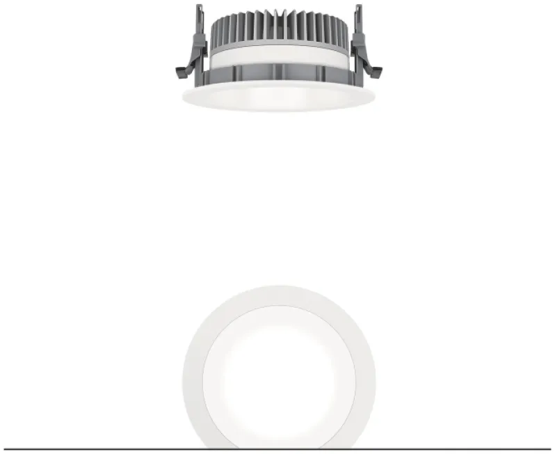 mit symmetrisch, breitstrahlender Lichtverteilung mit höchster Leuchteneffizienz und optimaler Lichttechnik, Bestückung: 9 W LED840, Farbwiedergabe Ra > 80, Farbtemperatur 4000 K (neutral weiß), Farborttoleranz (initial MacAdam): 3, Leuchten Lichtstrom: 1118 lm, Leuchten Lichtausbeute: 124 lm/W, Lebensdauer: 50000h bei 85% Lichtstrom, mit separter Vorschaltgeräte-Einheit, hochwertige Reflektoreinheit über Bajonettverschluss an modulare LED-Lichtkammer arretiert, hocheffiziente LED Lichtkammer integriert im optimierten, passiven Wärmemanagement aus Aluminiumdruckguss, Reflektor:glatt, weiß lackiert, Reflektor/Abdeckring eine Einheit aus hochwertigem, UV-beständigem Polycarbonat (PC), Abdeckring weiß, Einbauring aus Polycarbonat glasfaserverstärkt (PC), grau, werkzeuglose Schnellmontage der Leuchteneinheit mittels Bajonettverschluss, IP44_IP20, Leuchte halogenfrei verdrahtet, Anschluss: 3-polige Steckverbindungsklemme, Durchschleifen möglich, Netzspannung: 220-240V / 0/50/60Hz, Zentralbatterietauglich 220V DC, Montage: werkzeuglose Schnellmontage mittels Anti-Rutsch-Haltefedern für Deckenstärken von 1-40mm, Deckenausschnitt: 150mm, Einbautiefe: 81mm (Deckenstärke 1-25 mm), Gewicht: 0,76 kg, Hinweis: Für Office Anwendungen gemäß EN12464 (UGR<19, Reflektortyp aluminiumbesputtert) ist ein zusätzlicher Entblendungsring separat zu bestellen