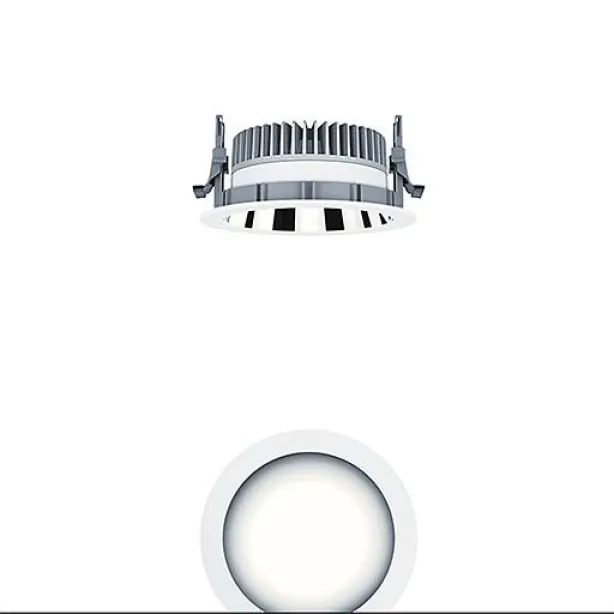 mit symmetrisch, breitstrahlender Lichtverteilung mit höchster Leuchteneffizienz und optimaler Lichttechnik, Bestückung: 9 W LED830, Farbwiedergabe Ra > 80, Farbtemperatur 3000 K (warm weiß), Farborttoleranz (initial MacAdam): 3, Leuchten Lichtstrom: 1108 lm, Leuchten Lichtausbeute: 123 lm/W, Lebensdauer: 50000h bei 85% Lichtstrom, mit separter Vorschaltgeräte-Einheit DALI steuerbare Leuchte (DALI only), hochwertige Reflektoreinheit über Bajonettverschluss an modulare LED-Lichtkammer arretiert, hocheffiziente LED Lichtkammer integriert im optimierten, passiven Wärmemanagement aus Aluminiumdruckguss, Reflektor:glatt, aluminiumbesputtert, hochglänzend, irisierungsfrei, Reflektor/Abdeckring eine Einheit aus hochwertigem, UV-beständigem Polycarbonat (PC), Abdeckring weiß, Einbauring aus Polycarbonat glasfaserverstärkt (PC), grau, werkzeuglose Schnellmontage der Leuchteneinheit mittels Bajonettverschluss, IP44_IP20, Leuchte halogenfrei verdrahtet, Anschluss: 5-polige Steckverbindungsklemme, Durchschleifen möglich, Netzspannung: 220-240V / 0/50/60Hz, Zentralbatterietauglich 220V DC, Montage: werkzeuglose Schnellmontage mittels Anti-Rutsch-Haltefedern für Deckenstärken von 1-40mm, Deckenausschnitt: 150mm, Einbautiefe: 81mm (Deckenstärke 1-25 mm), Gewicht: 0,79 kg, Hinweis: Für Office Anwendungen gemäß EN12464 (UGR<19, Reflektortyp aluminiumbesputtert) ist ein zusätzlicher Entblendungsring separat zu bestellen