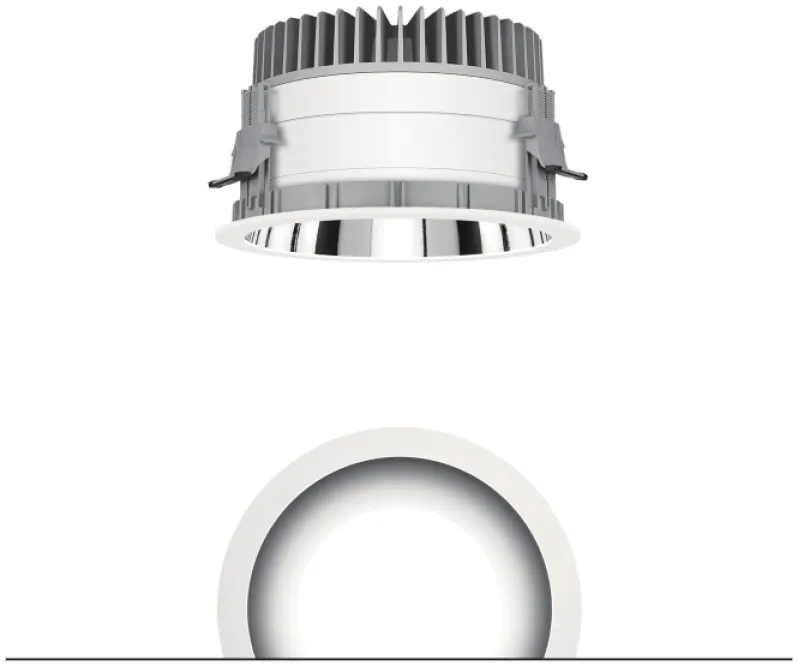 mit symmetrisch, breitstrahlender Lichtverteilung mit höchster Leuchteneffizienz und optimaler Lichttechnik, Bestückung: 15 W LED840, Farbwiedergabe Ra > 80, Farbtemperatur 4000 K (neutral weiß), Farborttoleranz (initial MacAdam): 3, Leuchten Lichtstrom: 1792 lm, Leuchten Lichtausbeute: 119 lm/W, Lebensdauer: 50000h bei 85% Lichtstrom, mit separter Vorschaltgeräte-Einheit, hochwertige Reflektoreinheit über Bajonettverschluss an modulare LED-Lichtkammer arretiert, hocheffiziente LED Lichtkammer integriert im optimierten, passiven Wärmemanagement aus Aluminiumdruckguss, Reflektor:glatt, aluminiumbesputtert, hochglänzend, irisierungsfrei, Reflektor/Abdeckring eine Einheit aus hochwertigem, UV-beständigem Polycarbonat (PC), Abdeckring weiß, Einbauring aus Polycarbonat glasfaserverstärkt (PC), grau, werkzeuglose Schnellmontage der Leuchteneinheit mittels Bajonettverschluss, IP44_IP20, Leuchte halogenfrei verdrahtet, Anschluss: 3-polige Steckverbindungsklemme, Durchschleifen möglich, Netzspannung: 220-240V / 0/50/60Hz, Zentralbatterietauglich 220V DC, Montage: werkzeuglose Schnellmontage mittels Anti-Rutsch-Haltefedern für Deckenstärken von 1-40mm, Deckenausschnitt: 200mm, Einbautiefe: 129mm, Gewicht: 1,31 kg, Hinweis: UGR<19 (Reflektortyp aluminiumbesputtert) für Office Anwendungen gemäß EN12464