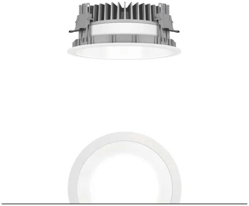 mit symmetrisch, breitstrahlender Lichtverteilung mit höchster Leuchteneffizienz und optimaler Lichttechnik, Bestückung: 15 W LED840, Farbwiedergabe Ra > 80, Farbtemperatur 4000 K (neutral weiß), Farborttoleranz (initial MacAdam): 3, Leuchten Lichtstrom: 1890 lm, Leuchten Lichtausbeute: 126 lm/W, Lebensdauer: 50000h bei 85% Lichtstrom, mit separater Vorschaltgeräte-Einheit, hochwertige Reflektoreinheit über Bajonettverschluss an modulare LED-Lichtkammer arretiert, hocheffiziente LED Lichtkammer integriert im optimierten, passiven Wärmemanagement aus Aluminiumdruckguss, Reflektor:glatt, weiß lackiert, Reflektor/Abdeckring eine Einheit aus hochwertigem, UV-beständigem Polycarbonat (PC), Abdeckring weiß, Einbauring aus Polycarbonat glasfaserverstärkt (PC), grau, werkzeuglose Schnellmontage der Leuchteneinheit mittels Bajonettverschluss, IP44_IP20, Leuchte halogenfrei verdrahtet, Anschluss: 3-polige Steckverbindungsklemme, Durchschleifen möglich, Netzspannung: 220-240V / 0/50/60Hz, Zentralbatterietauglich 220V DC, Montage: werkzeuglose Schnellmontage mittels Anti-Rutsch-Haltefedern für Deckenstärken von 1-40mm, Deckenausschnitt: 200mm, Einbautiefe: 89mm, Gewicht: 1,21 kg, Hinweis: Für Office Anwendungen gemäß EN12464 (UGR<19, Reflektortyp aluminiumbesputtert) ist ein zusätzlicher Entblendungsring separat zu bestellen
