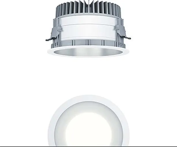 mit symmetrisch, breitstrahlender Lichtverteilung mit höchster Leuchteneffizienz und optimaler Lichttechnik, Bestückung: LED2500-930, Farbwiedergabe Ra > 90 (R9> 50), Farbtemperatur 3000 K (warm weiß), Farborttoleranz (initial MacAdam): 2, Leuchten Leistung: 19 W, Leuchten Lichtstrom: 2255 lm, Leuchten Lichtausbeute: 119 lm/W, Lebensdauer: 100000h bei 90% Lichtstrom bzw. 50000h bei 95% Lichtstrom, mit separter Vorschaltgeräte-Einheit DALI steuerbare Leuchte (DALI only), hochwertige Reflektoreinheit über Bajonettverschluss an modulare LED-Lichtkammer arretiert, hocheffiziente LED Lichtkammer integriert im optimierten, passiven Wärmemanagement aus Aluminiumdruckguss, Reflektor:glatt, aluminiumfarben beschichtet, matt, Reflektor/Abdeckring eine Einheit aus hochwertigem, UV-beständigem Polycarbonat (PC), Abdeckring weiß, Einbauring aus Polycarbonat glasfaserverstärkt (PC), grau, werkzeuglose Schnellmontage der Leuchteneinheit mittels Bajonettverschluss, IP44_IP20, Leuchte halogenfrei verdrahtet, Anschluss: 5-polige Steckverbindungsklemme,, Durchschleifen möglich, Netzspannung: 220-240V / 0/50/60Hz, Zentralbatterietauglich 220V DC , Montage: werkzeuglose Schnellmontage mittels Anti-Rutsch-Haltefedern für Deckenstärken von 1-40mm, Deckenausschnitt: 200mm, Einbautiefe: 129mm, Gewicht: 1,29 kg, Hinweis: UGR<19 (Reflektortyp aluminiumbesputtert) für Office Anwendungen gemäß EN12464