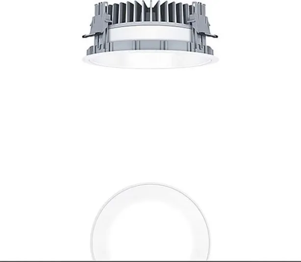 mit symmetrisch, breitstrahlender Lichtverteilung mit höchster Leuchteneffizienz und optimaler Lichttechnik, Bestückung: LED2500-940, Farbwiedergabe Ra > 90 (R9>50), Farbtemperatur 4000 K (neutral weiß), Farborttoleranz (initial MacAdam): 2, Leuchten Leistung: 19 W, Leuchten Lichtstrom: 2619 lm, Leuchten Lichtausbeute: 138 lm/W, Lebensdauer: 100000h bei 90% Lichtstrom bzw. 50000h bei 95% Lichtstrom, mit separter Vorschaltgeräte-Einheit DALI steuerbare Leuchte (DALI only), hochwertige Reflektoreinheit über Bajonettverschluss an modulare LED-Lichtkammer arretiert, hocheffiziente LED Lichtkammer integriert im optimierten, passiven Wärmemanagement aus Aluminiumdruckguss, Reflektor:glatt, weiß lackiert, Reflektor aus hochwertigem, UV-beständigem Polycarbonat (PC), werkzeuglose Schnellmontage der Leuchteneinheit mittels Bajonettverschluss, IP20, Leuchte halogenfrei verdrahtet, Anschluss: 5-polige Steckverbindungsklemme,, Durchschleifen möglich, Netzspannung: 220-240V / 0/50/60Hz, Zentralbatterietauglich 220V DC , Montage: werkzeuglose Schnellmontage mittels Anti-Rutsch-Haltefedern für Deckenstärken von 1-40mm, Deckenausschnitt: 200mm, Einbautiefe: 91mm, Gewicht: 1,11 kg, Hinweis: Aufnahmering (Planarring) zum deckenbündigen Einbau der Leuchte ist separat zu bestellen (siehe Zubehör), für Office Anwendungen gemäß EN12464 (UGR<19, Reflektortyp aluminiumbesputtert) ist ein zusätzlicher Entblendungsring separat zu bestellen